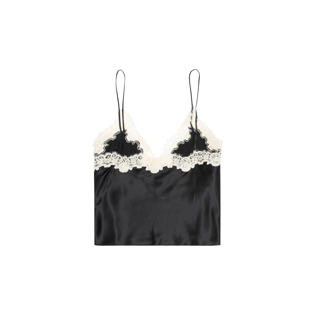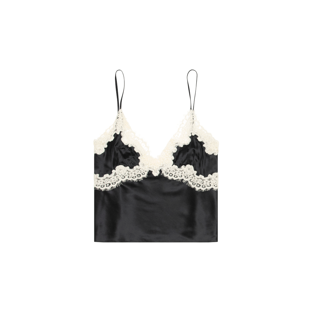 Dôen Neria Top in Black features buttery garment washed silk satin, ultra skinny adjustable spaghetti straps, slightly cropped bias-cut hem, and plunging V-neck trimmed with intricate contrast lace.