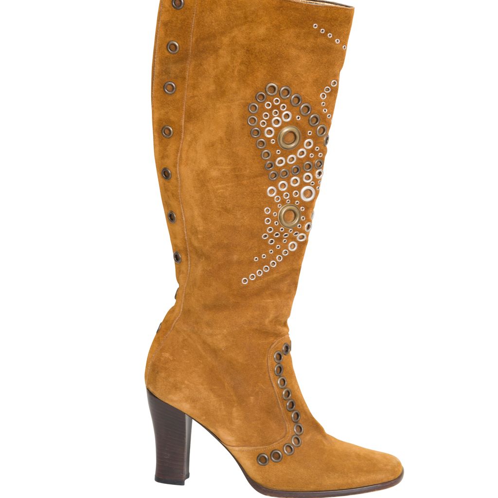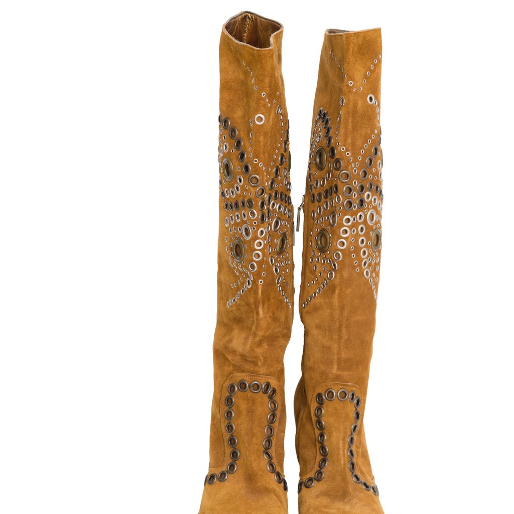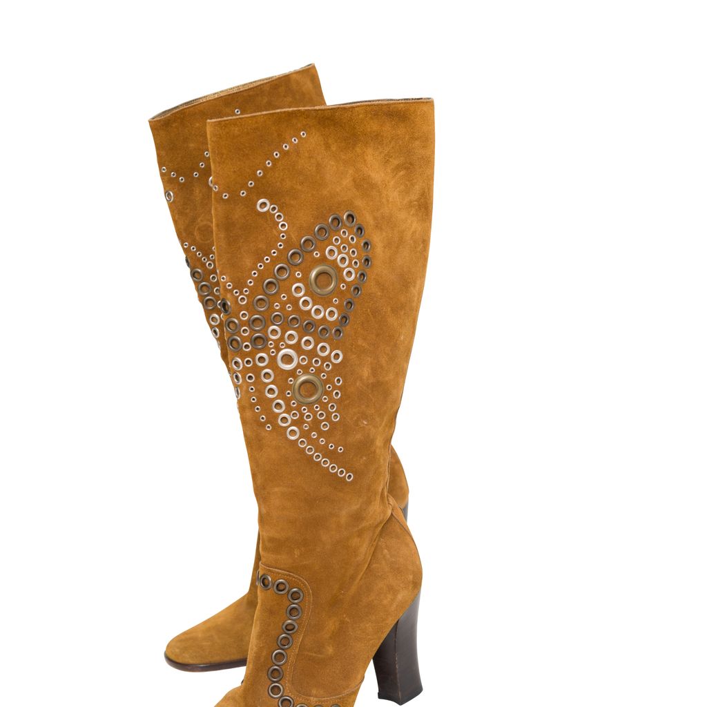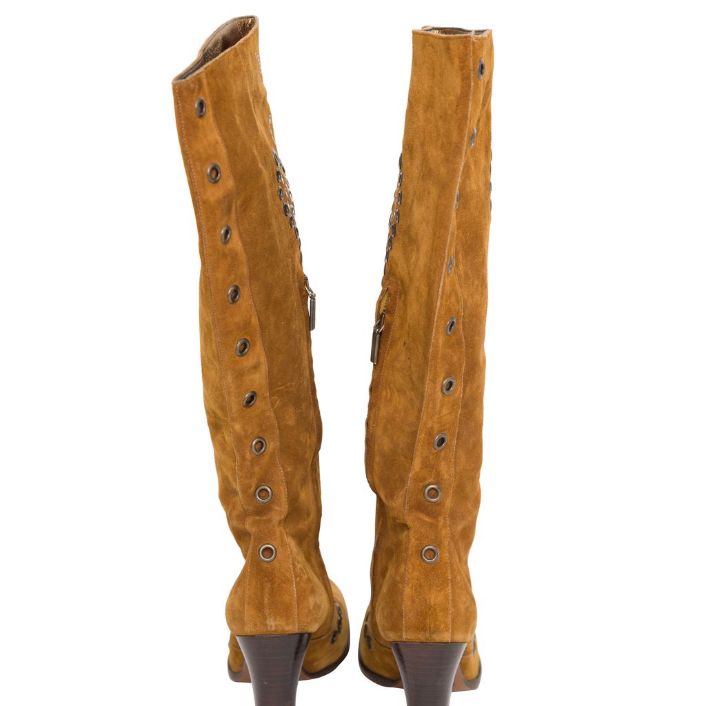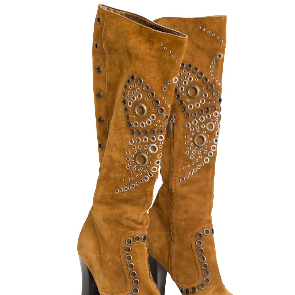 Dolce and Gabbana Butterfly Knee High Boots feature a soft suede texture, metal eyelet detail in a butterfly shape, and a wooden chunk heel.