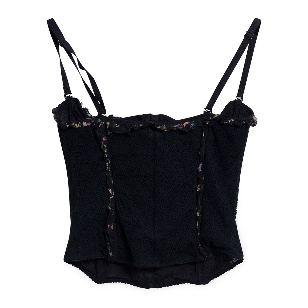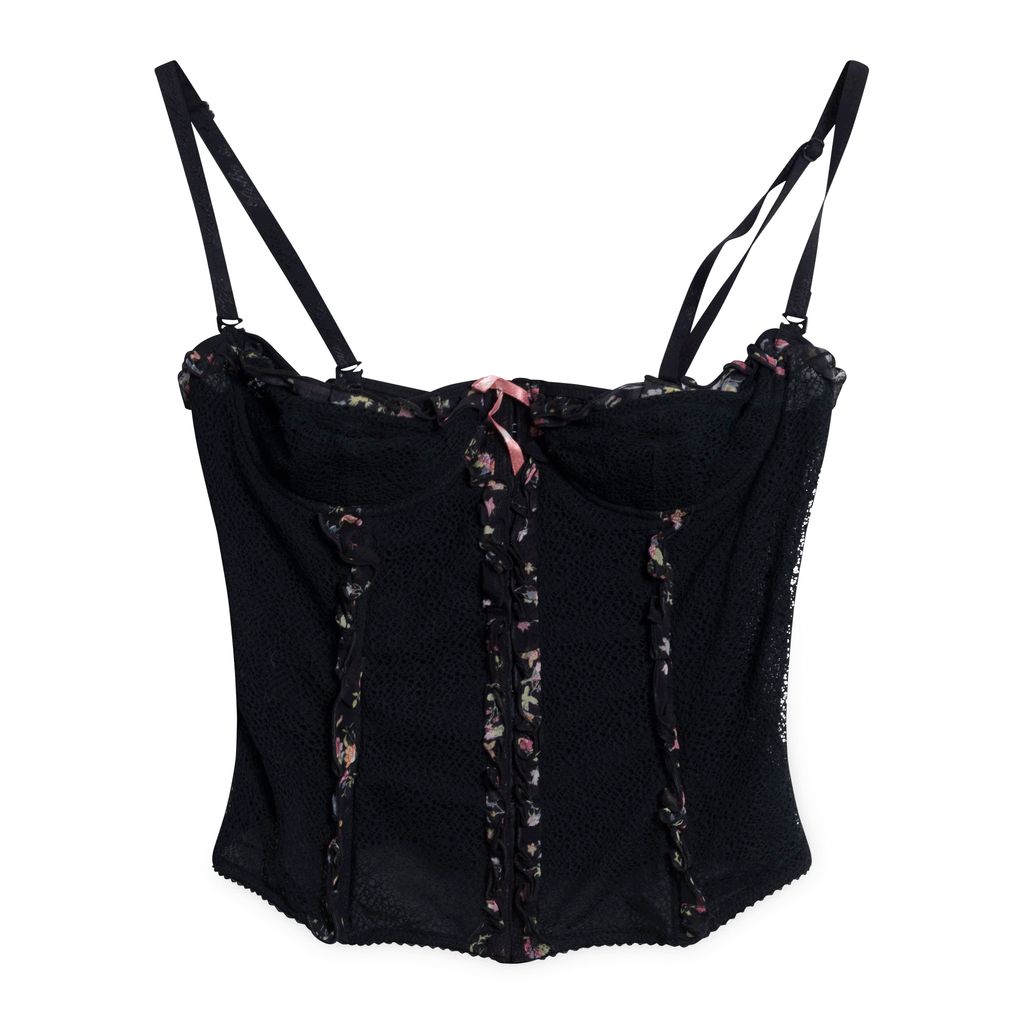 Corset features black lace design with pint floral graphics and pink ribbon accent