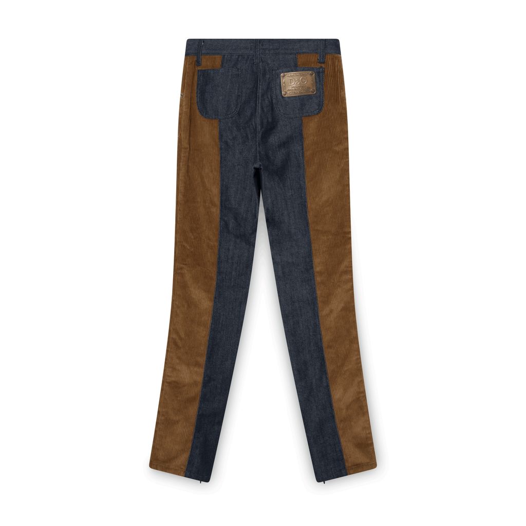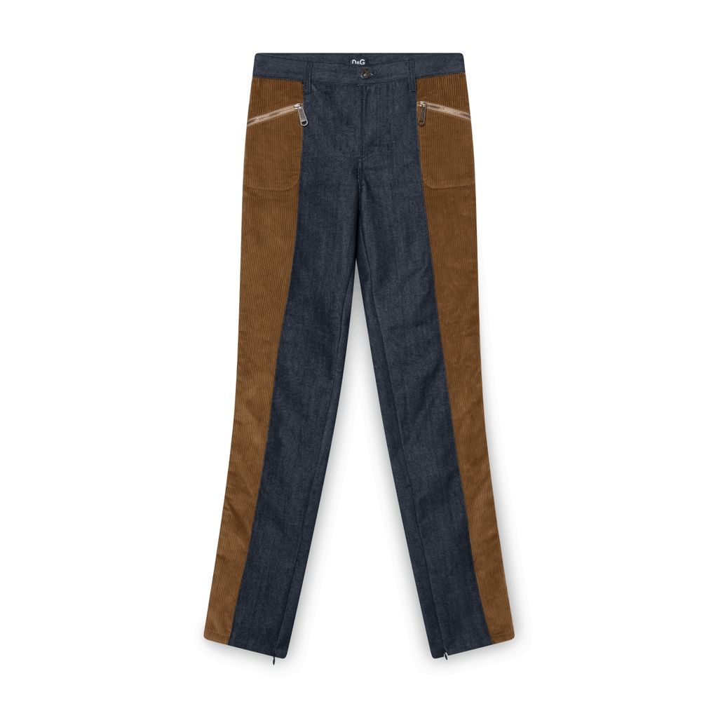 Dolce and Gabbana Split Corduroy Jeans features dark denim, corduroy side panels, and 2 side zippers.