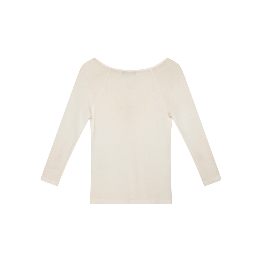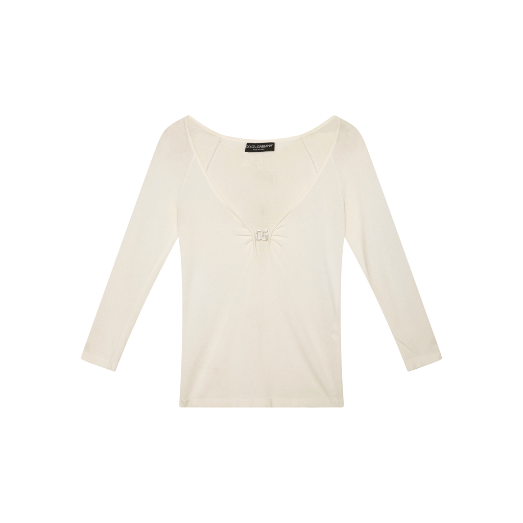 Dolce & Gabbana Cream Long Sleeve features silver diamond logo at chest, V-neck, and 3/4 length sleeves.