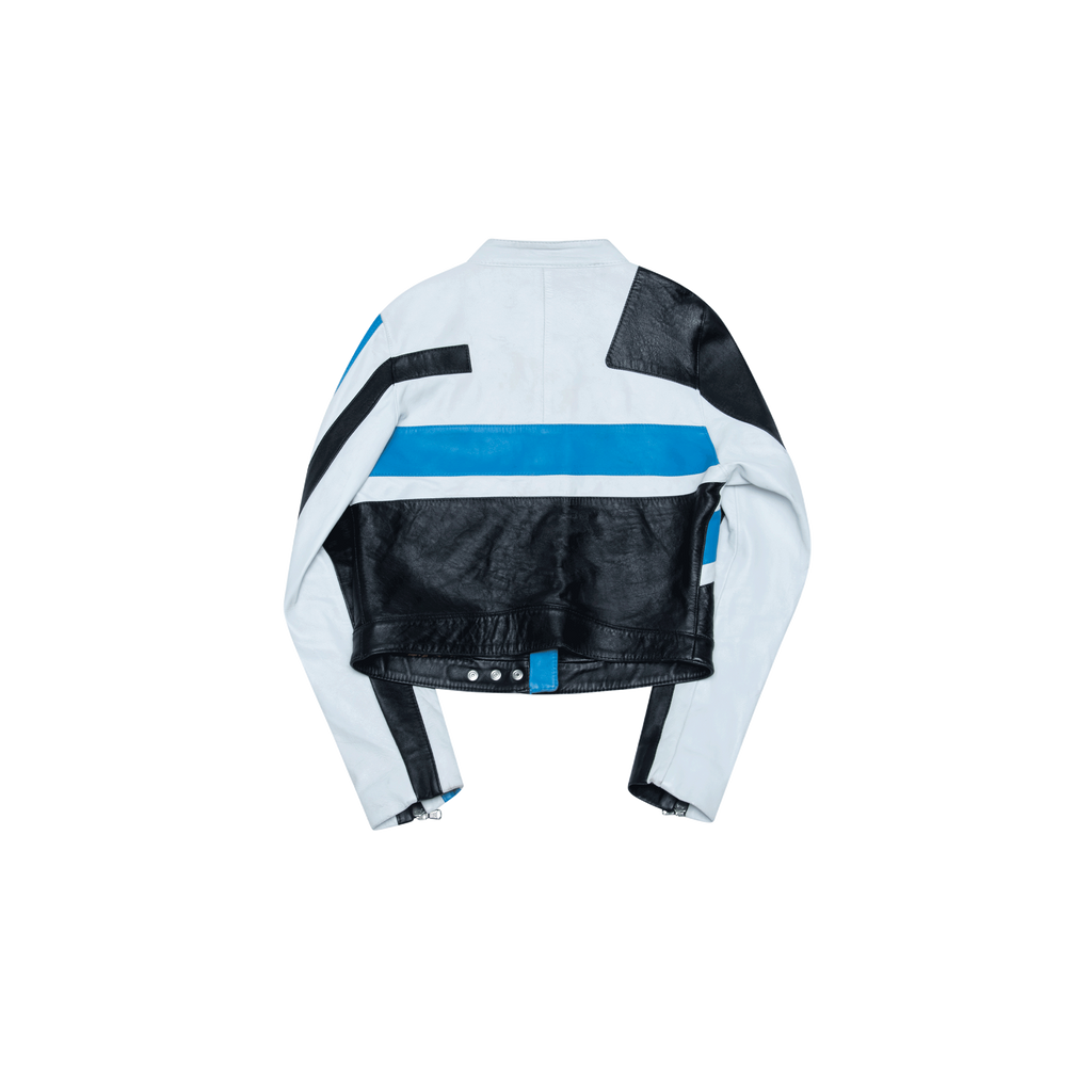 Dolce & Gabbana SS 2001 Colorblock Leather Jacket features black, white, and blue leather body, leopard satin inner lining, silver hardware accents, and a stand collar.