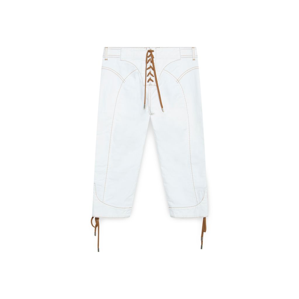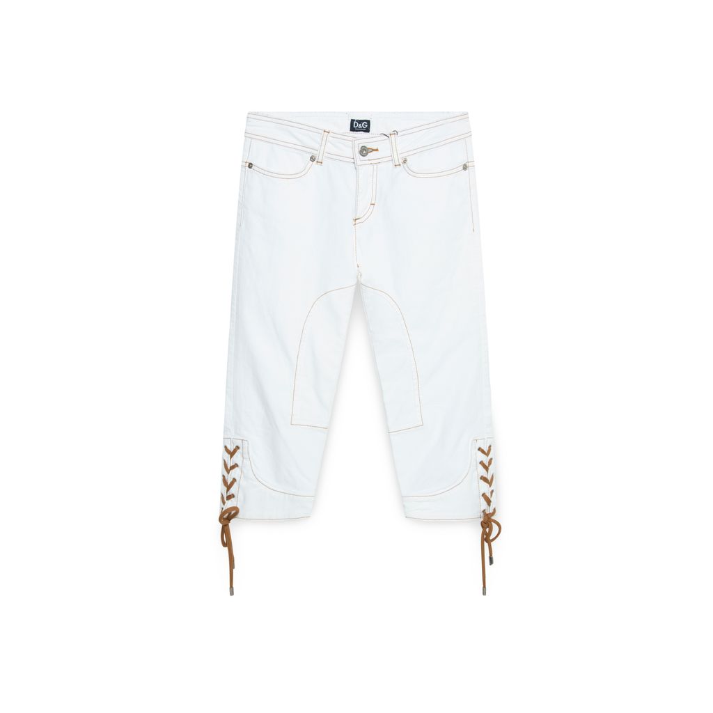 Dolce & Gabbana White Lace Up Capris features front zip closure, low rise, back and side brown lace up detailing, and brown contrast stitching.