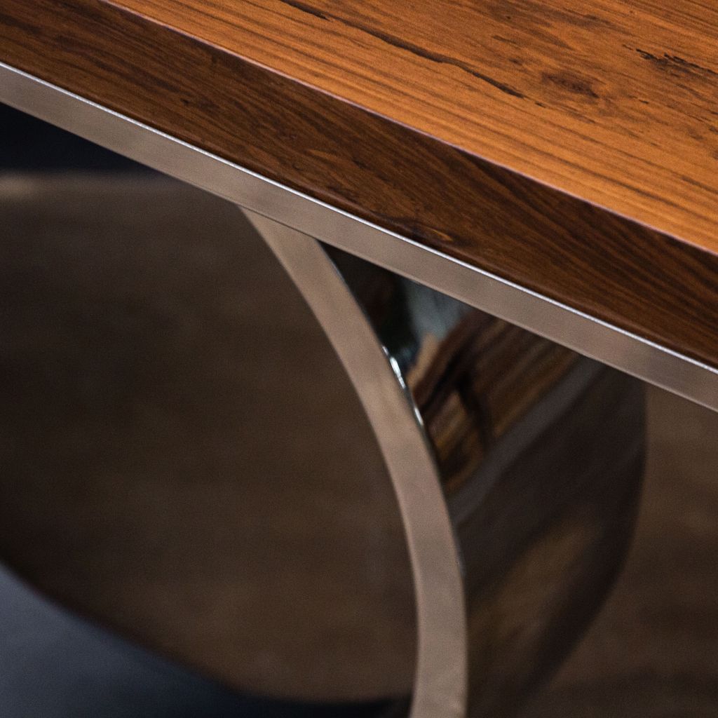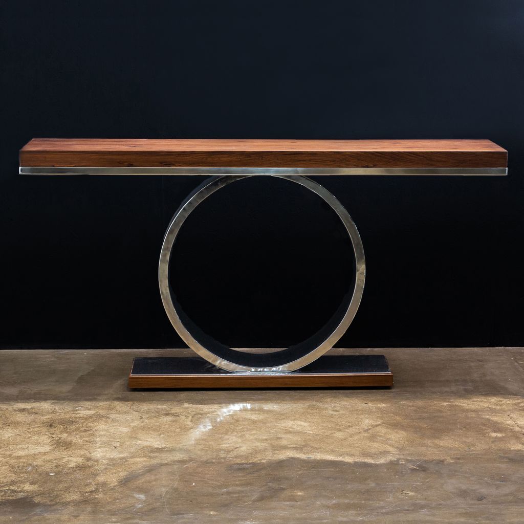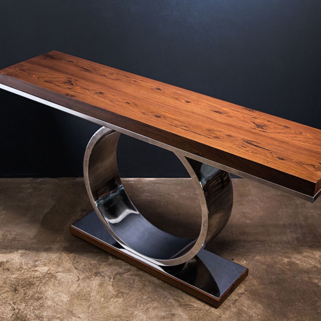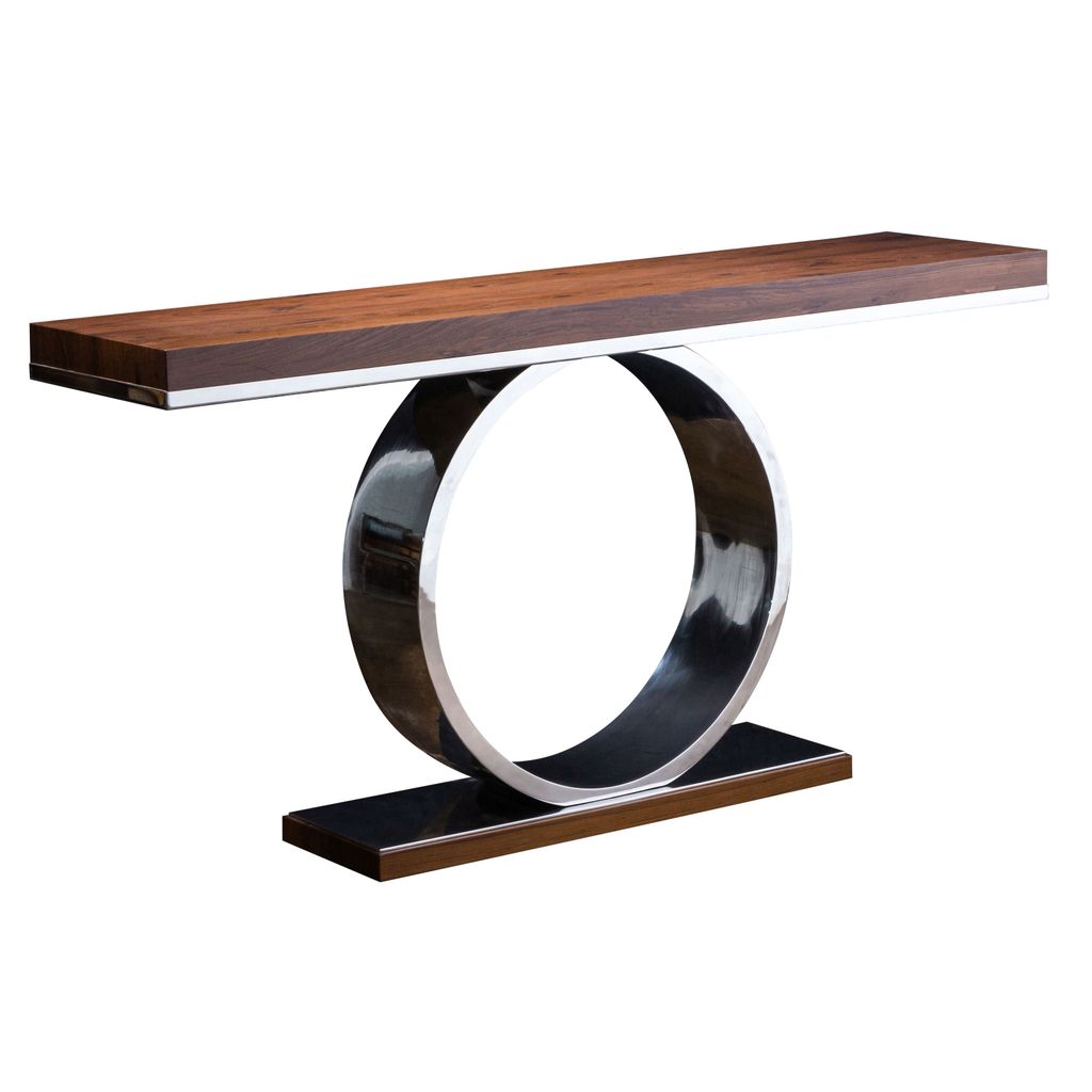 The Donte Console table features a ring-shaped metal base, shown here in polished steel, supporting a wood-top, available in any species.