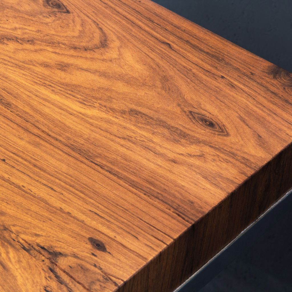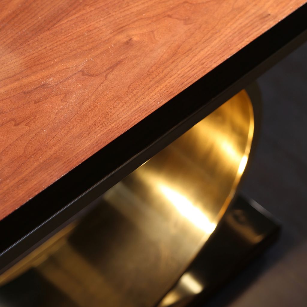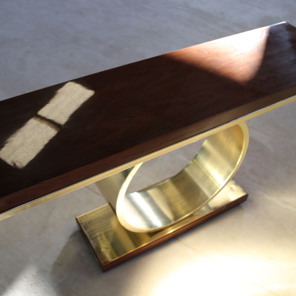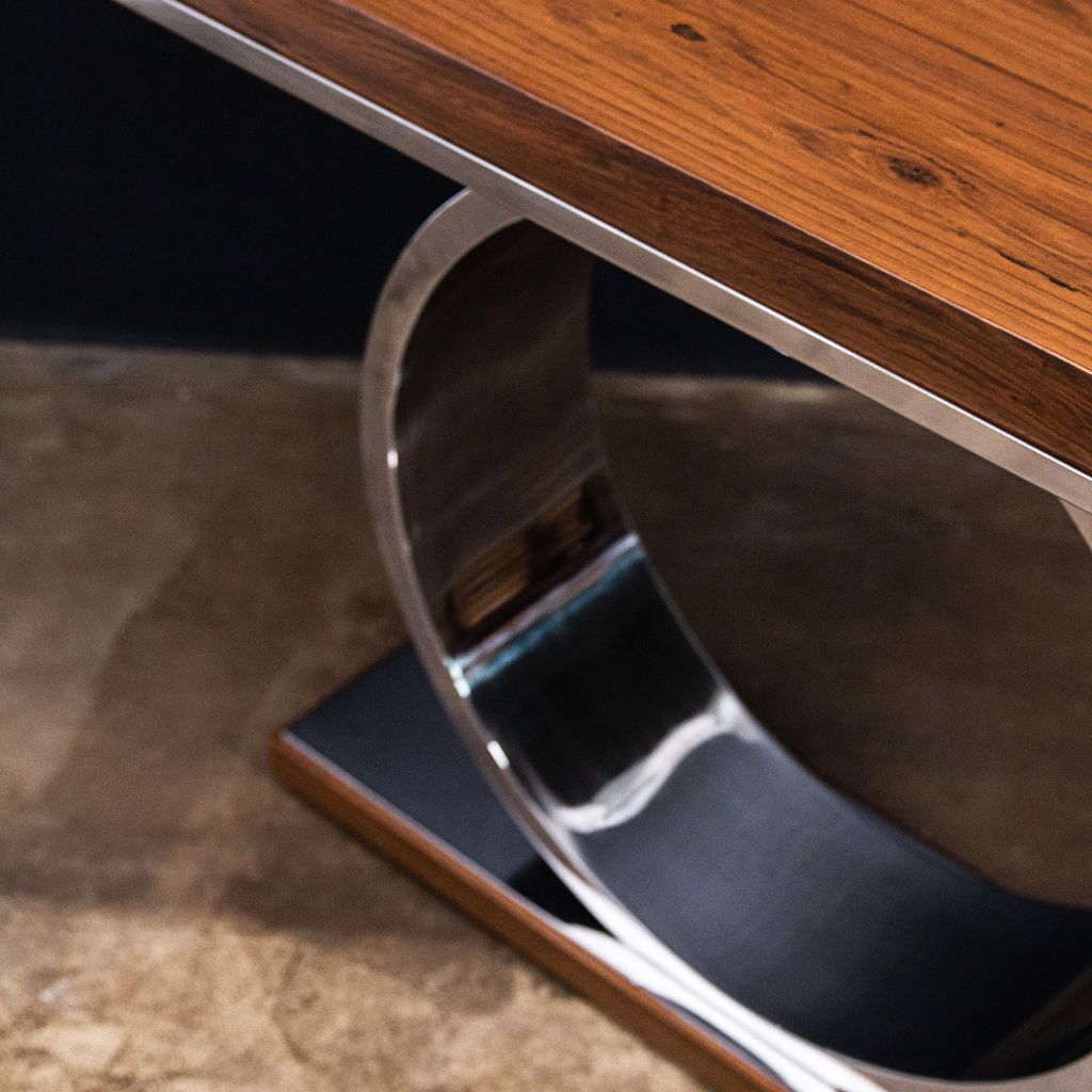 The Donte Console table features a ring-shaped metal base, shown here in polished steel, supporting a wood-top, available in any species.
