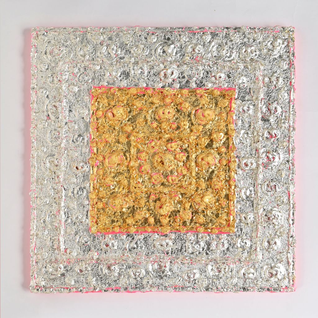 Donut Peach ドーナッツピーチ by Keiko Moriuchi, 2024 is acrylic on canvas with 24k gold leaf and 18k white gold leaf.