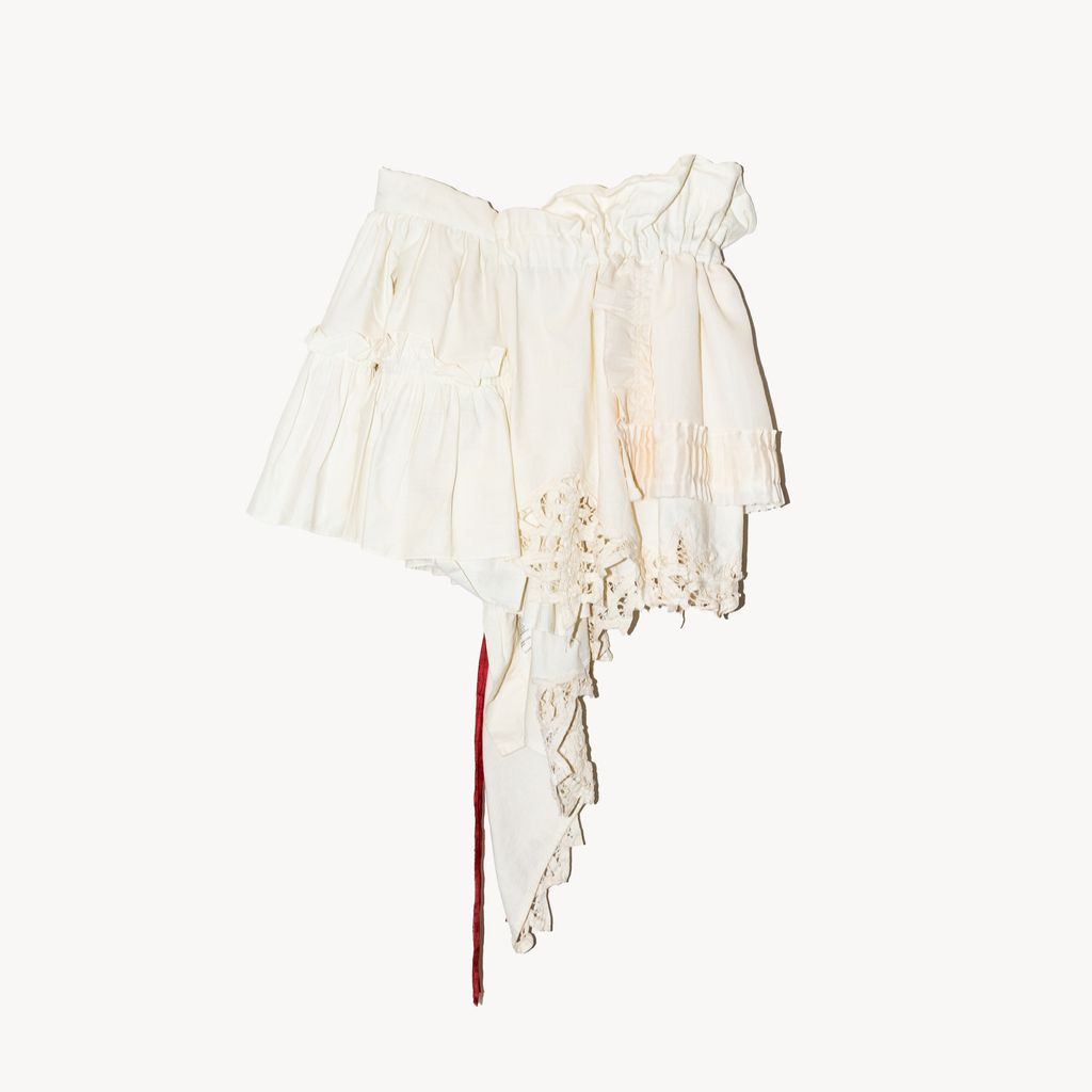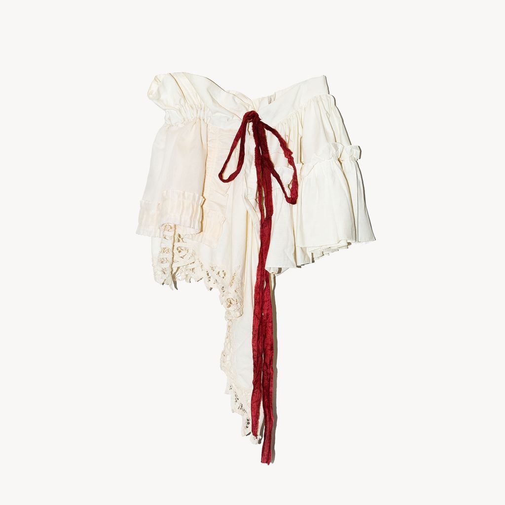 Handmade from vintage home wear textiles and dyed silk ribbon. Paper bag waist allows for open sizing.