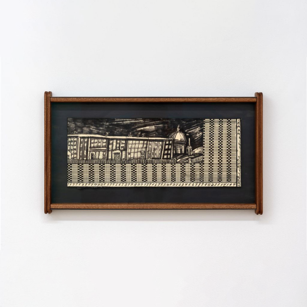 Ink drawing on paper in mahogany and steel custom frame made by the artist.