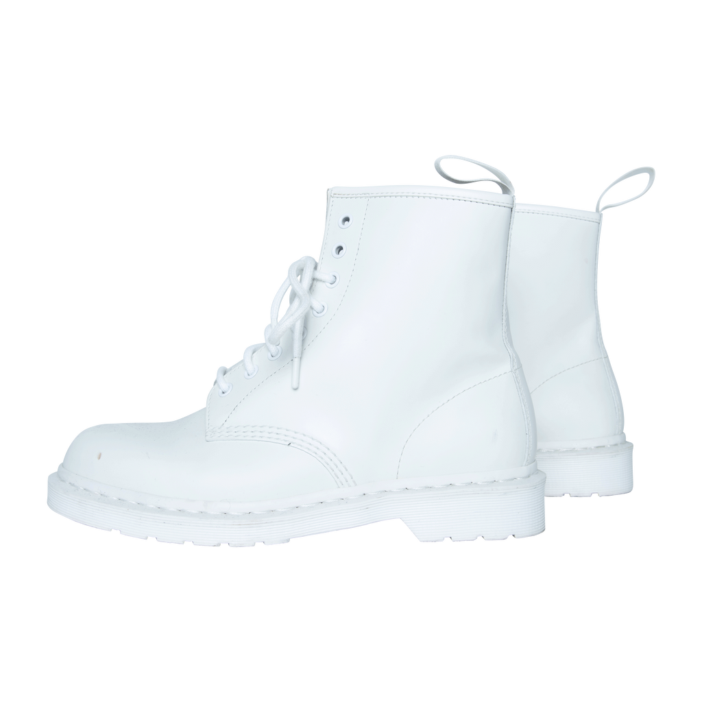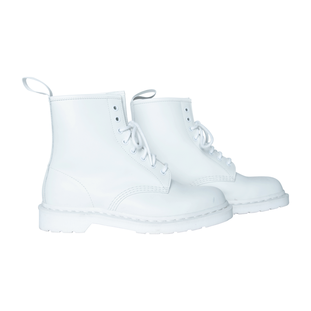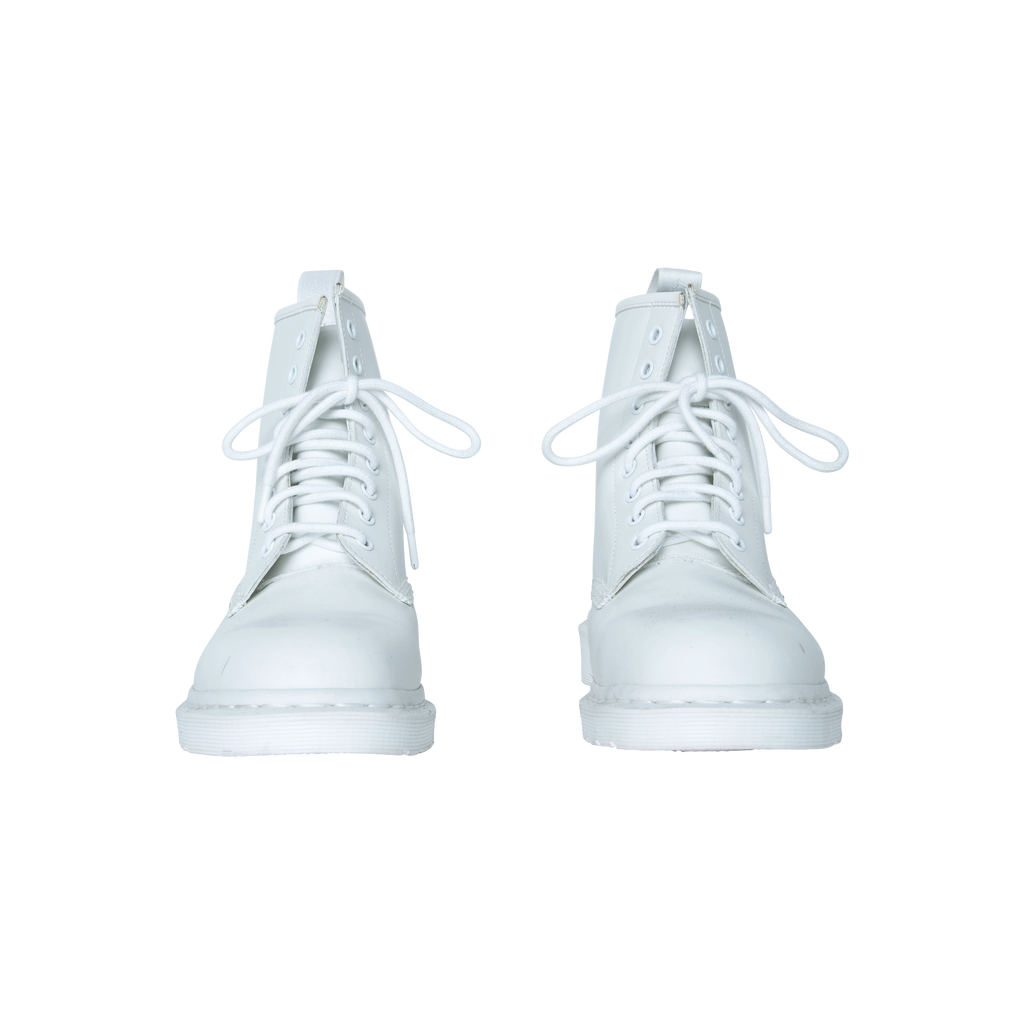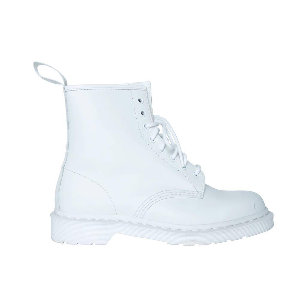Dr Martens 1460 Mono Smooth Leather Lace Up Boots in White features grooved sides, visible stitching, heel loop, and air cushioned sole.