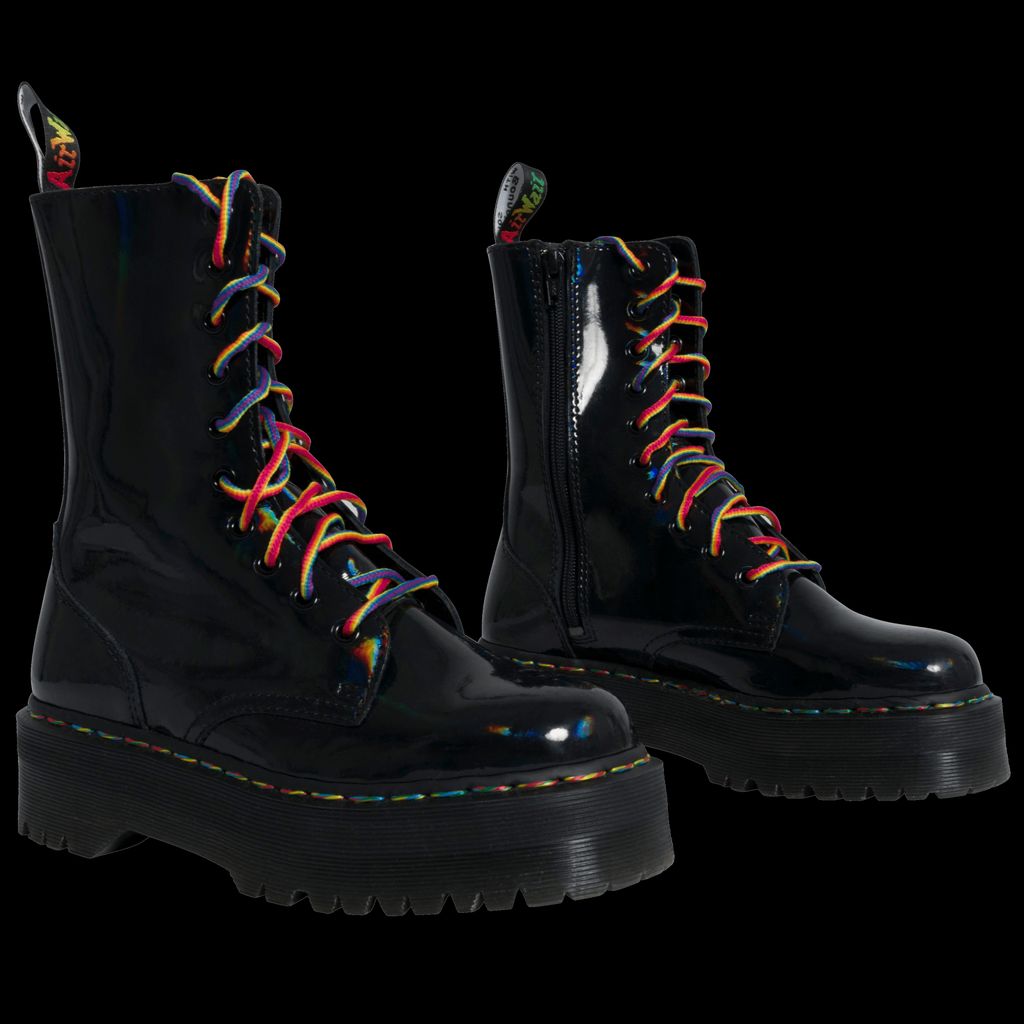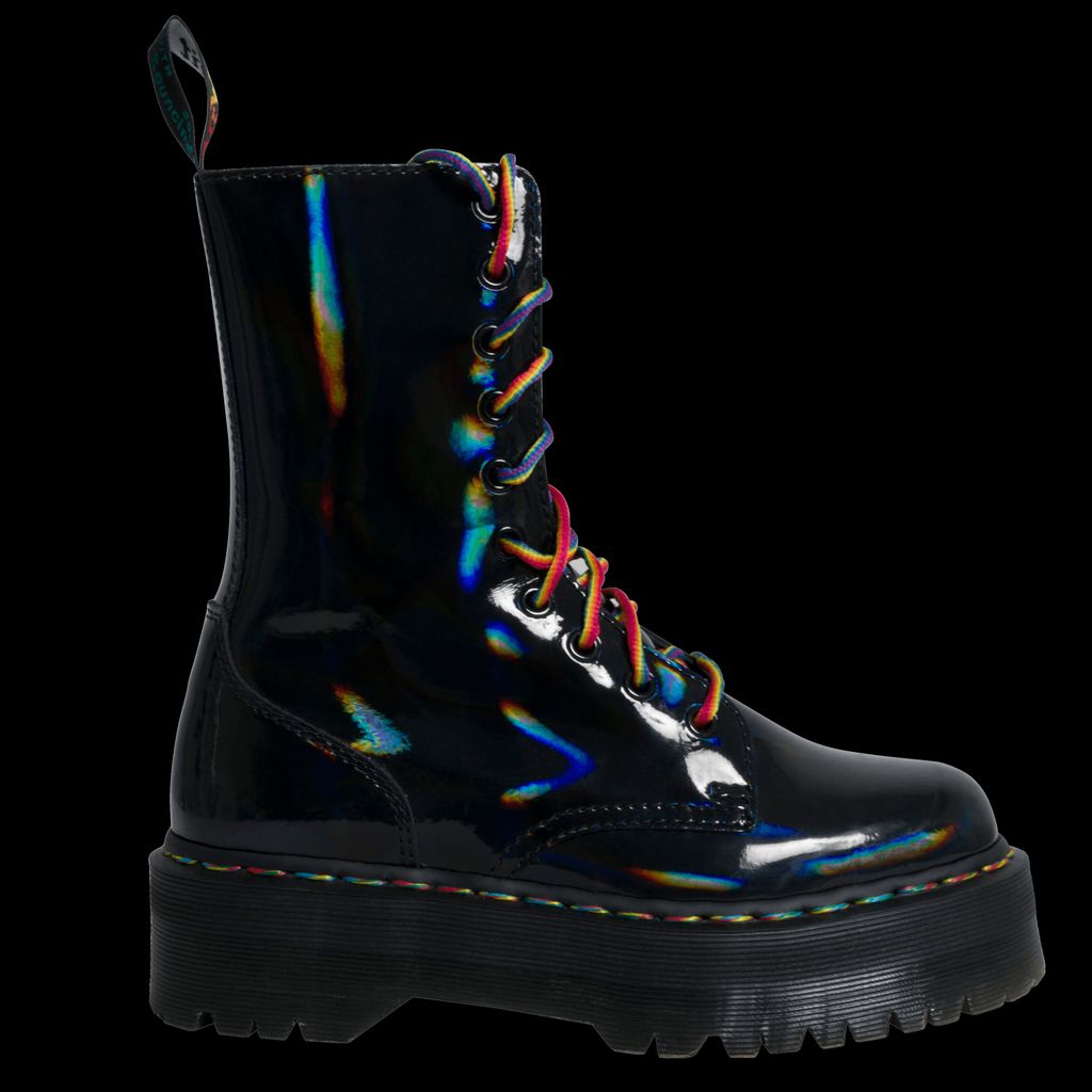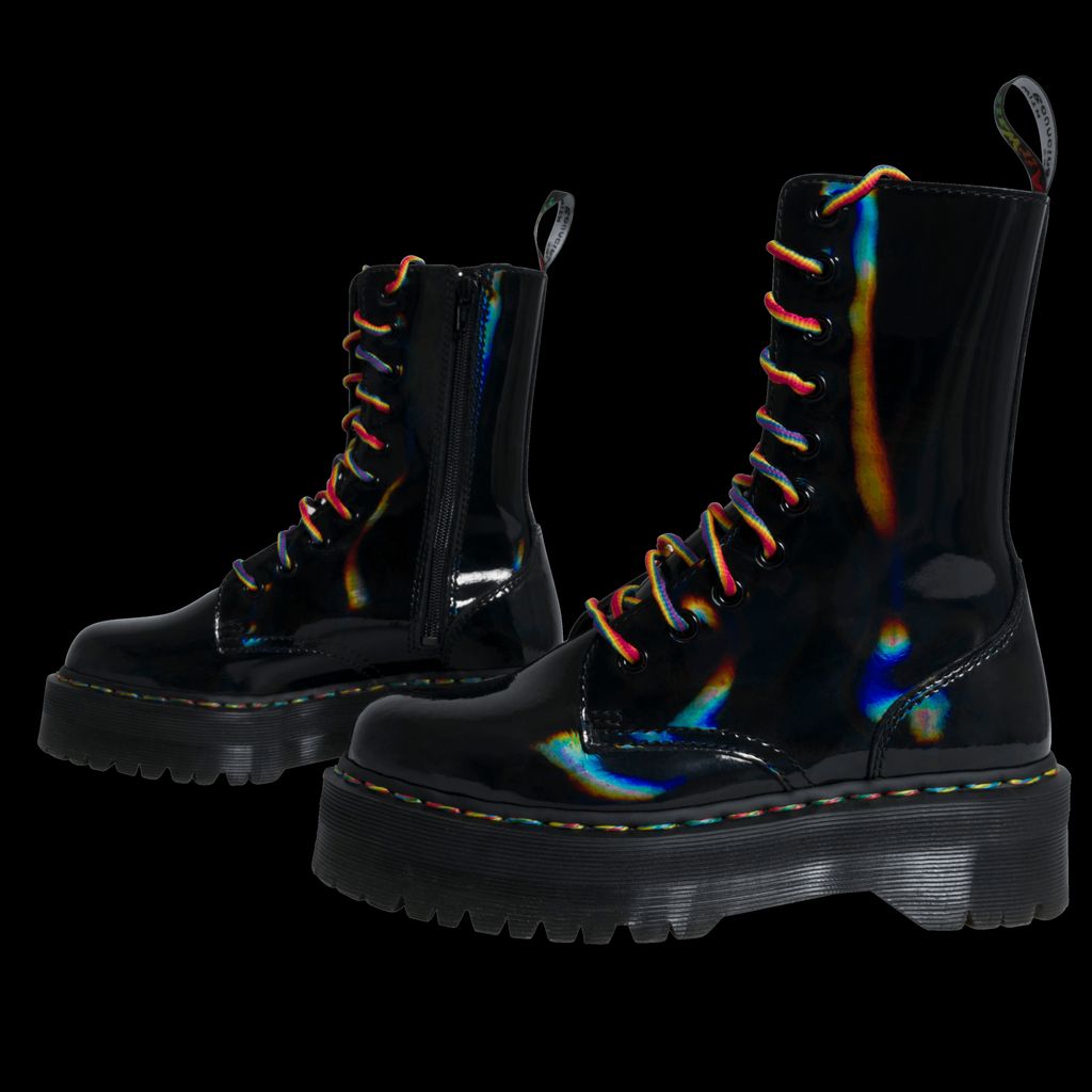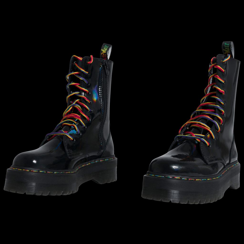 These super platform boots from Dr. Martens features a unique black leather that reflects iridescent rainbow light. Finished with a 10-eye lace up closure with rainbow laces, side zipper closure, and back pull tab. In good condition. Minor scuffing. Comes with original box.