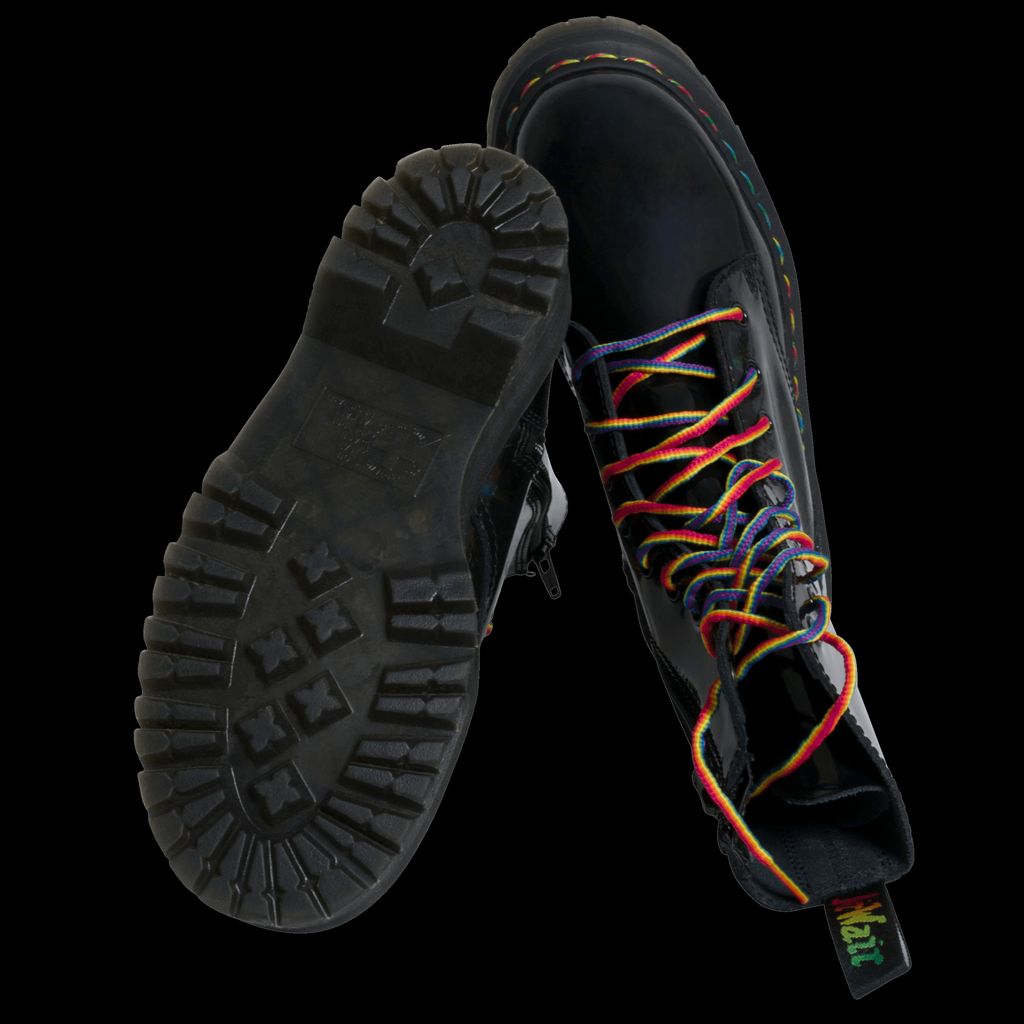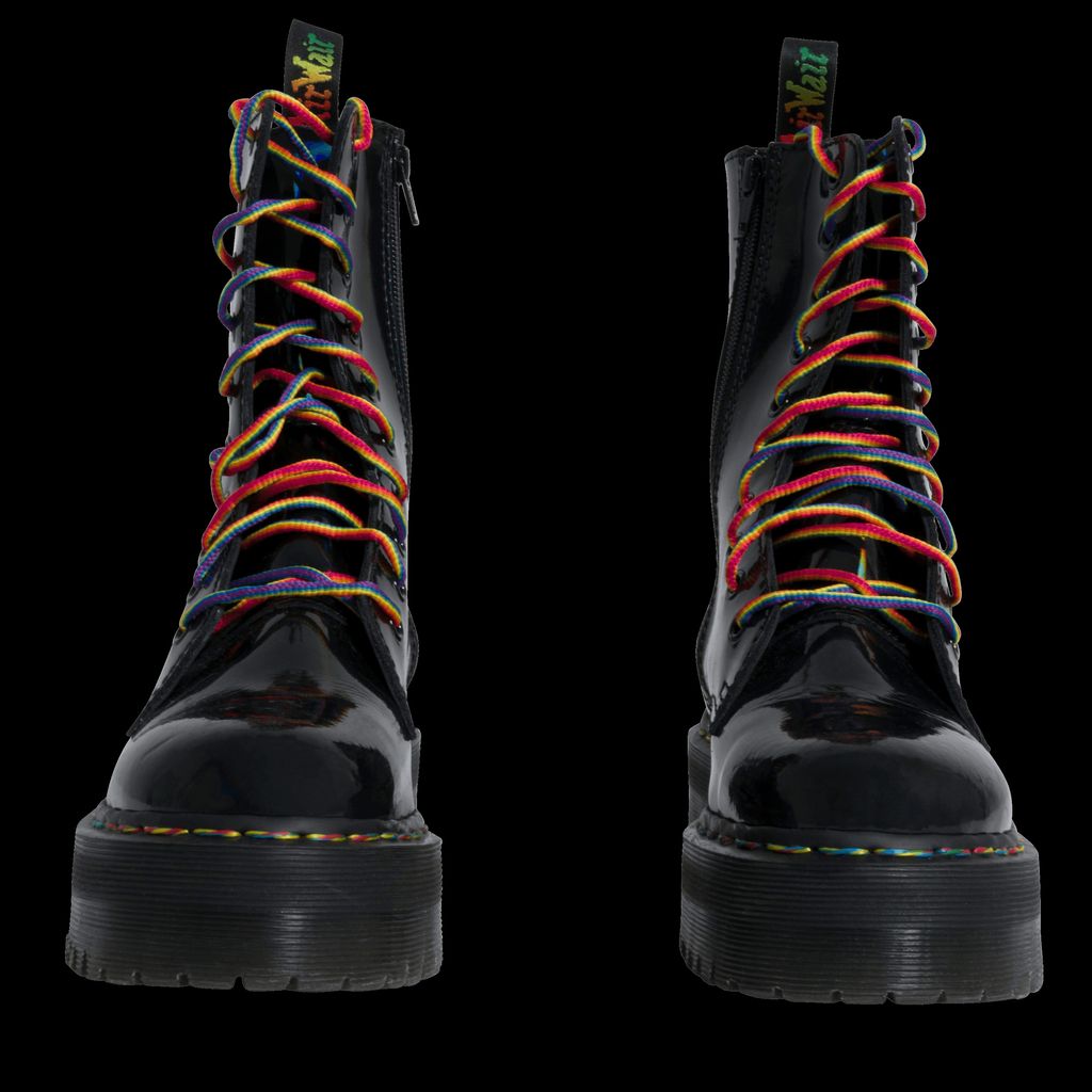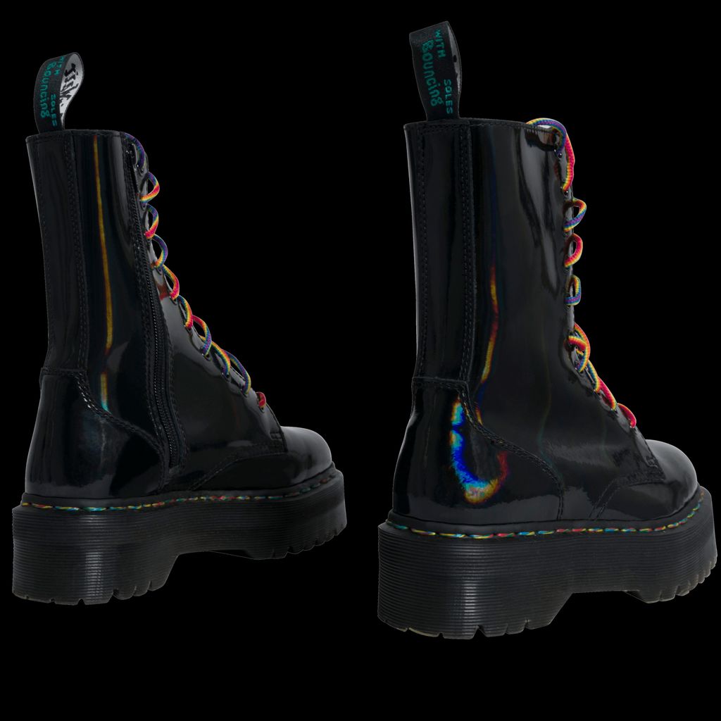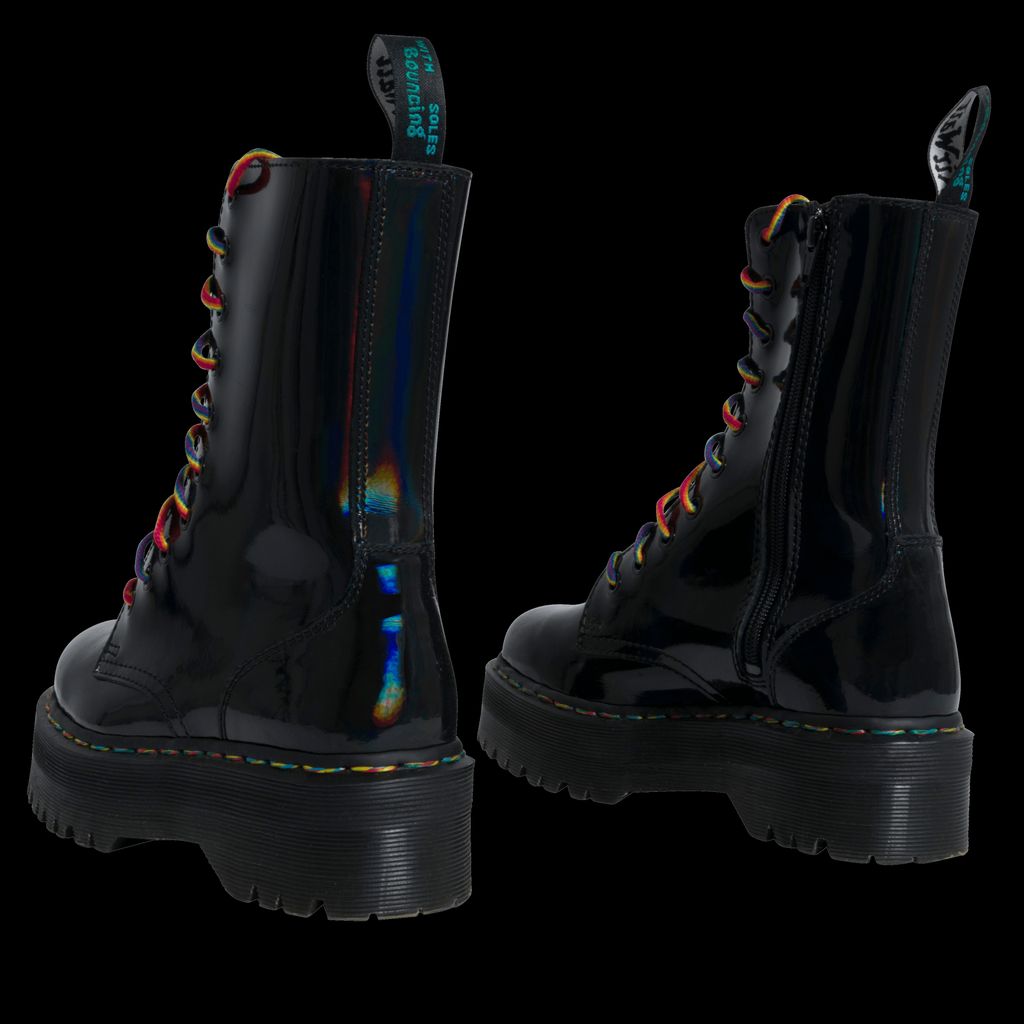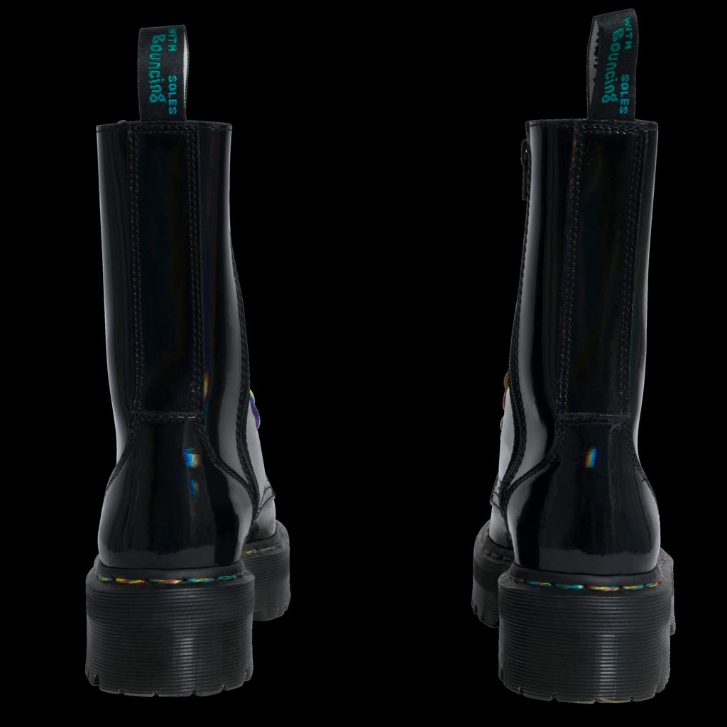 These super platform boots from Dr. Martens features a unique black leather that reflects iridescent rainbow light. Finished with a 10-eye lace up closure with rainbow laces, side zipper closure, and back pull tab. In good condition. Minor scuffing. Comes with original box.