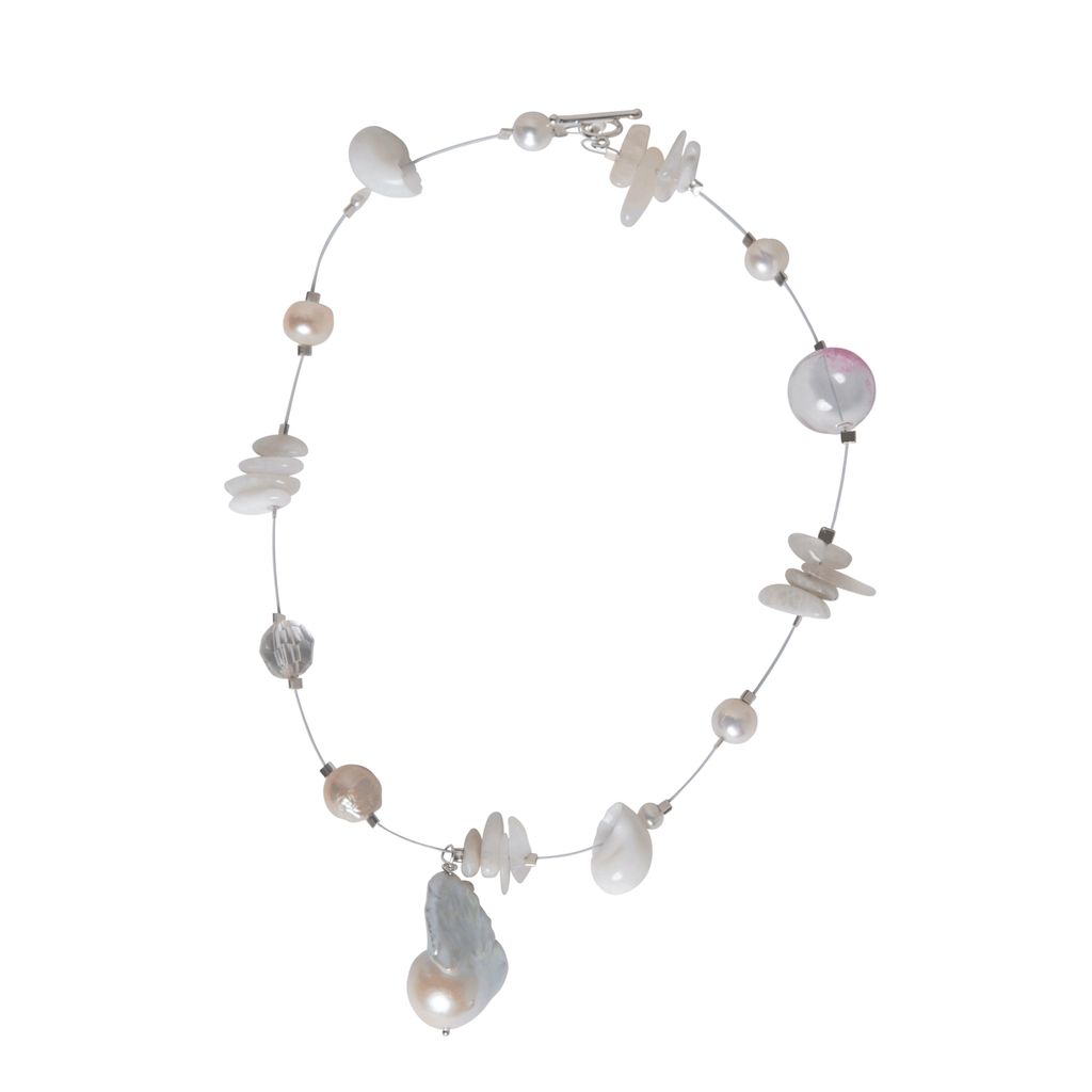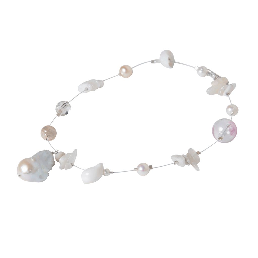 Blown glass bead, moonstone, freshwater pearls, upcycled shells, Baroque pearl pendant, 925 Silver Hardware