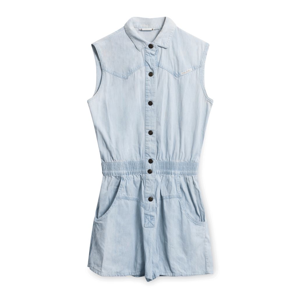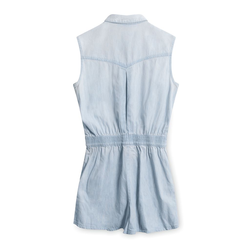 Denim Romper with bronze plated snaps going down the chest to above the inseam. Romper features an elastic waistband and two pockets below the waist.