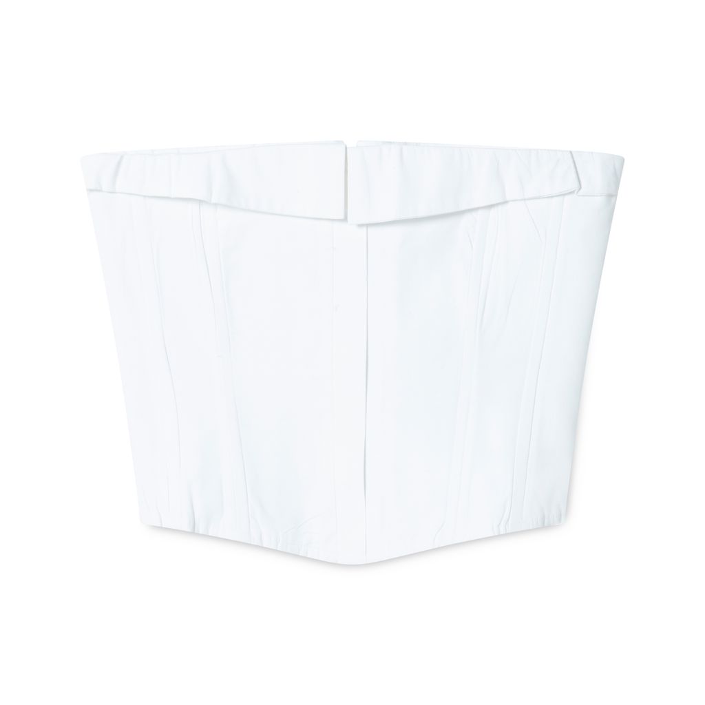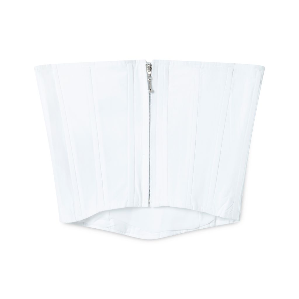 Taking the universally loved closet staple -- the crisp white button up, we've reimagined her into the most feminine form; a corset. We're thinking... summer in Europe. Rooftop date nights. Picnics in the park. Minimal and versatile, dress her down with boyfriend jeans, or dress her up with our Pintuck Trouser or Micro Skirt. Construction includes a mock lapel around the bust and a center placket in the front. Light boning throughout with a silver zipper closure in the center back. Ethically and locally made in Los Angeles. Outer fabric is Japanese cotton. The lining is a locally sourced dead stock polyester.