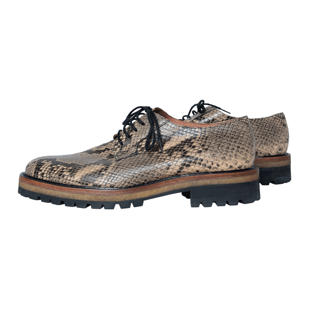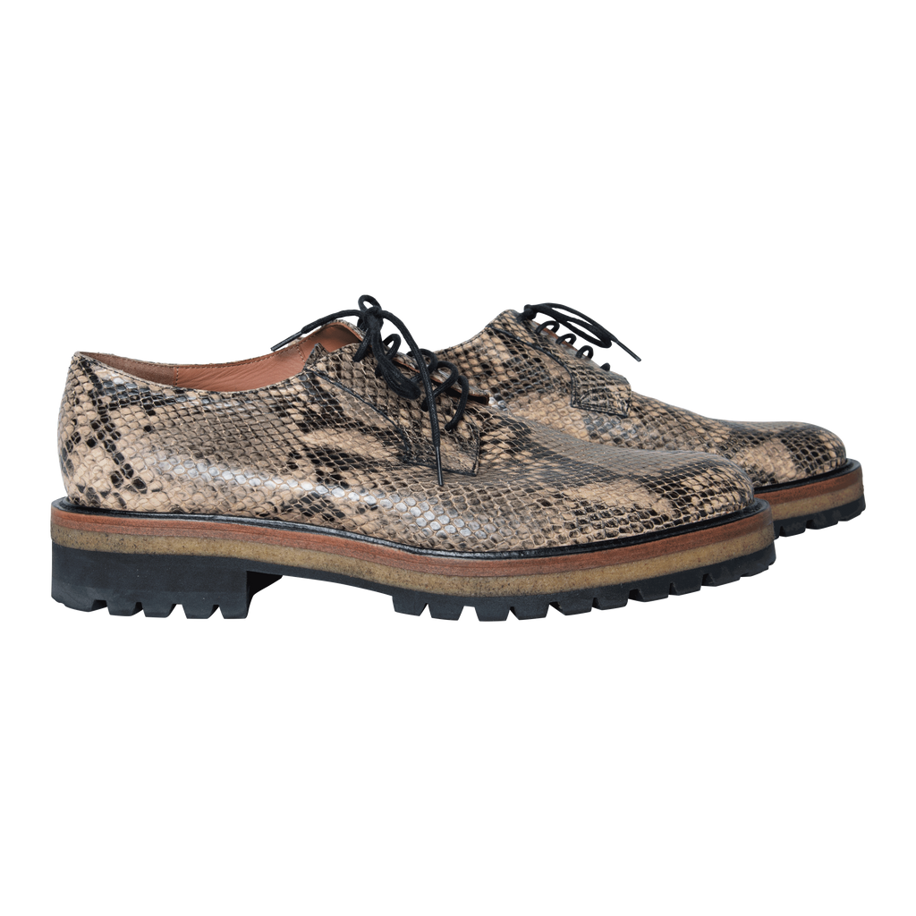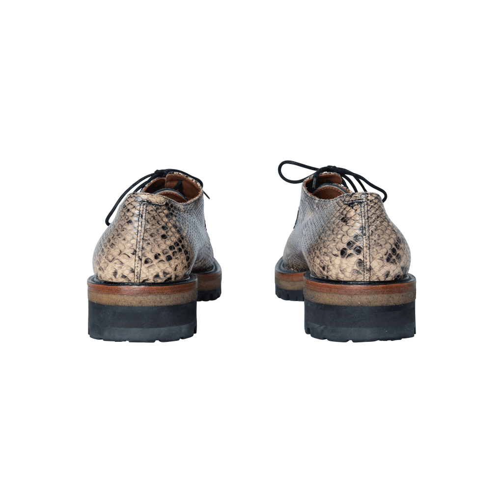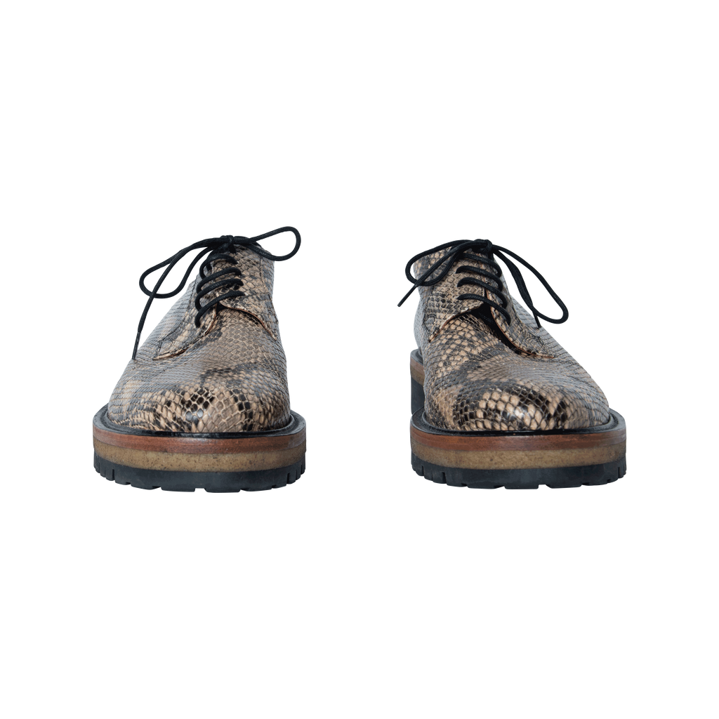 Dries Van Noten Beige Snakeskin Derby Shoes features snakeskin pattern all over and black laces on upper.
