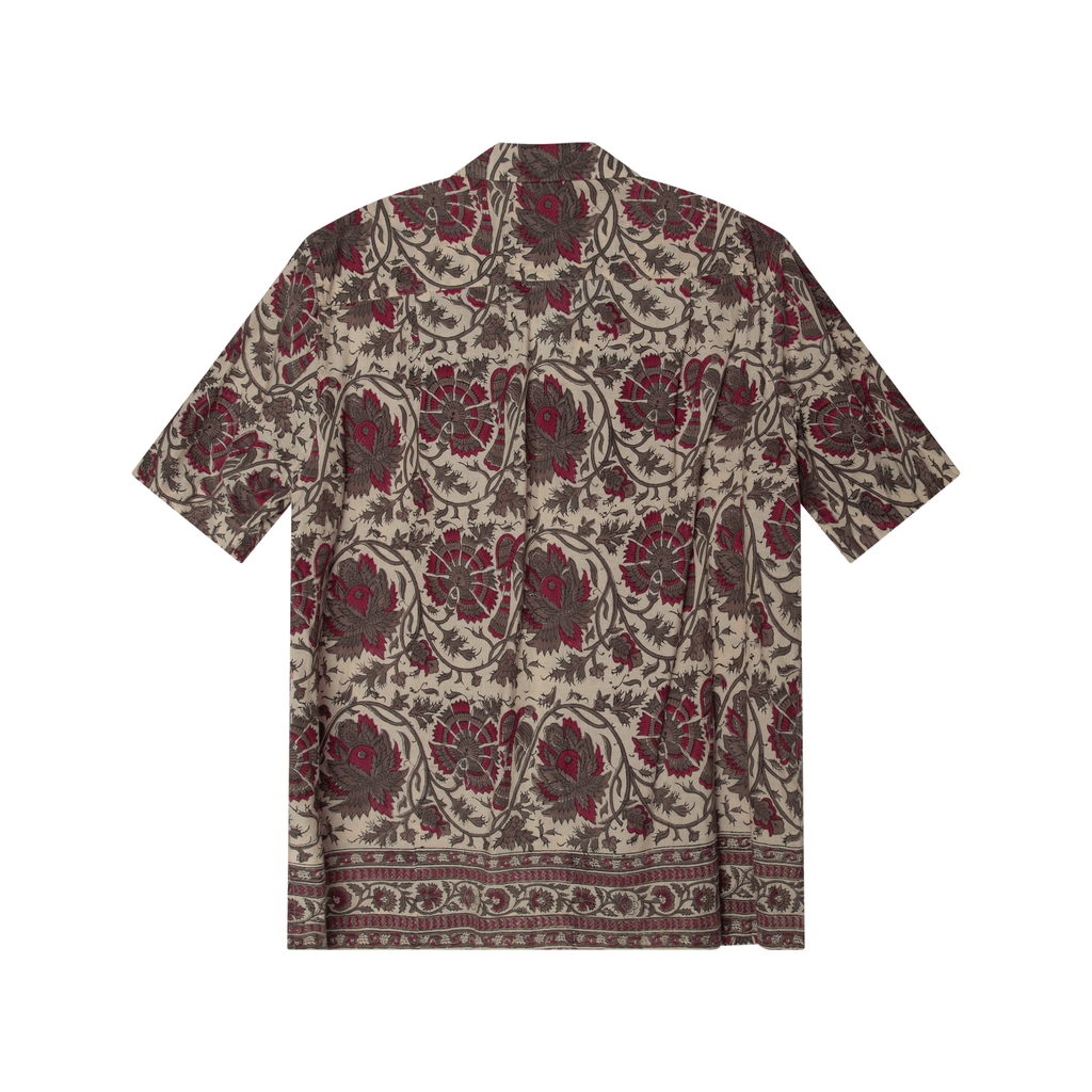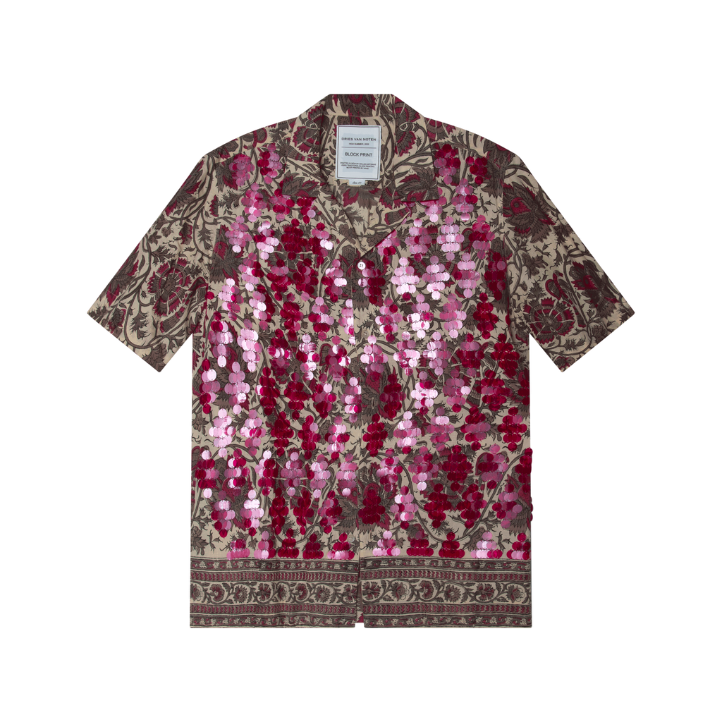 Dries Van Noten Block Print Button Up features camp collar, front button closure, embellished designs in the front, and block print motif all over.