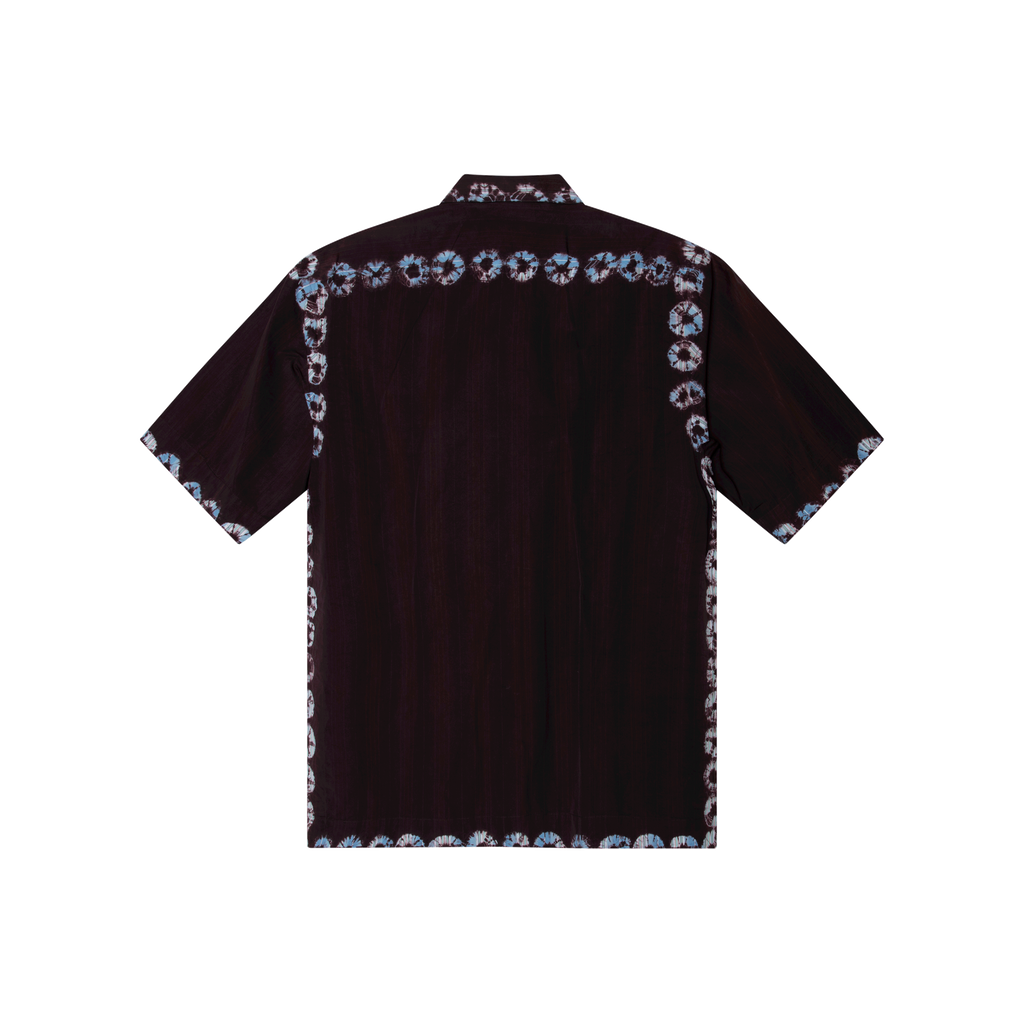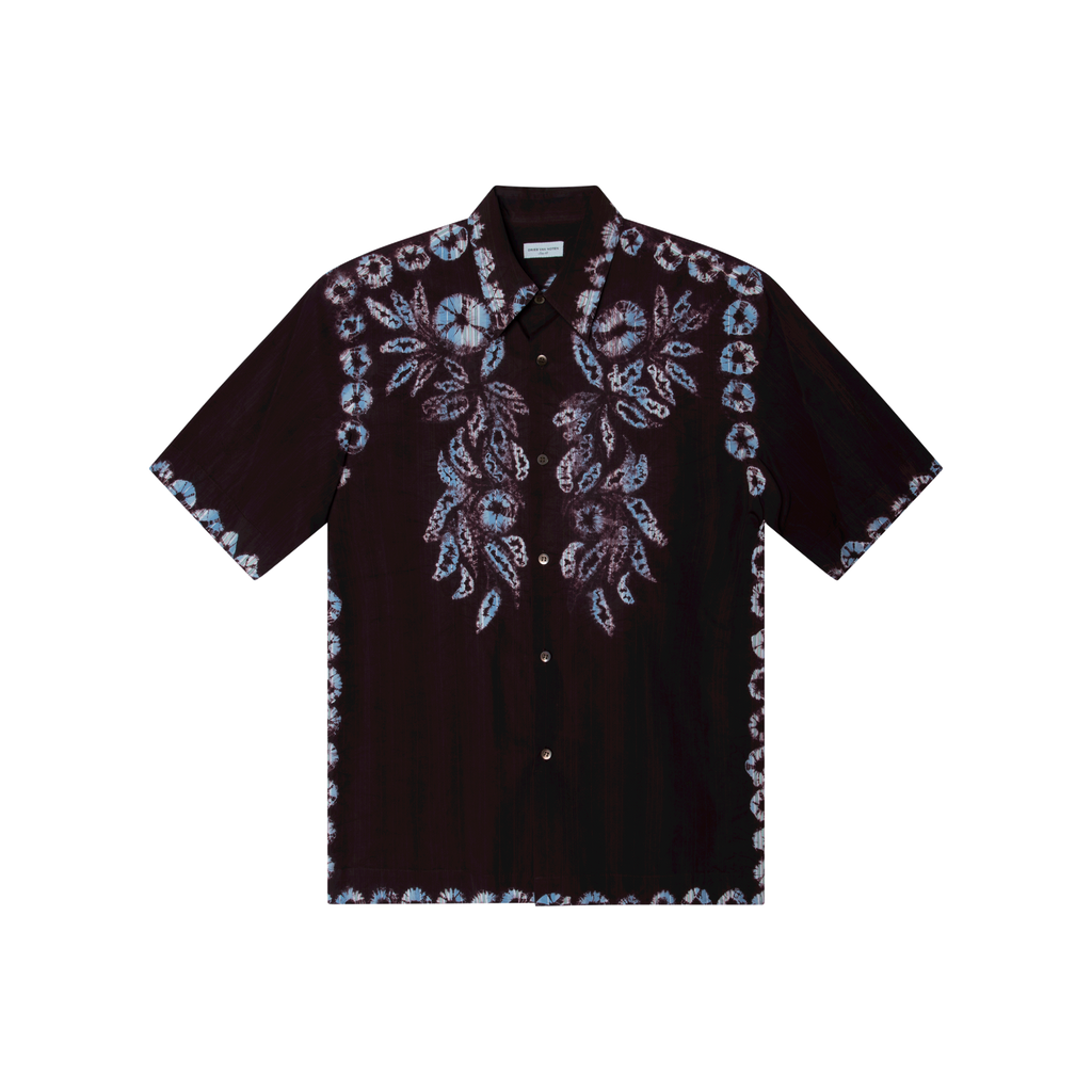 Dries Van Noten Brown Tie Dye Shirt features brown tie dye design over blue striped shirt and front button closure.