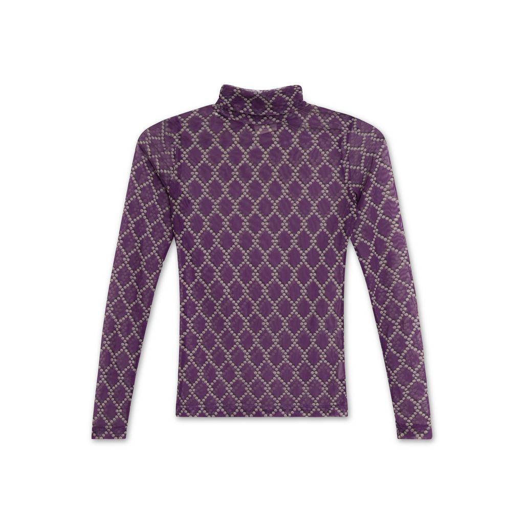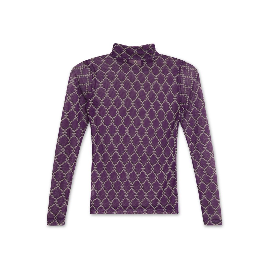 Dries Van Noten Long Sleeve Mesh Top features turtleneck collar, printed bead design throughout.