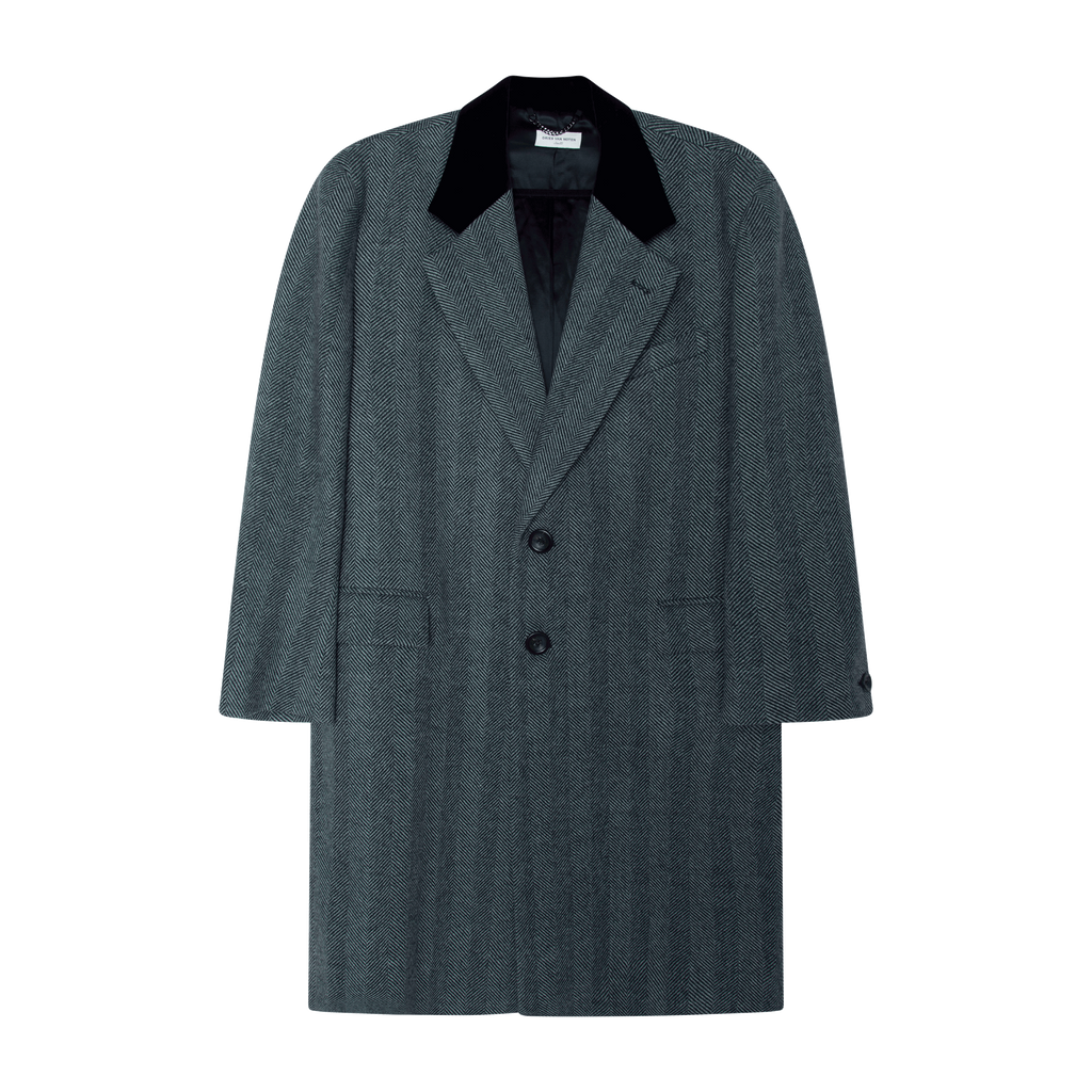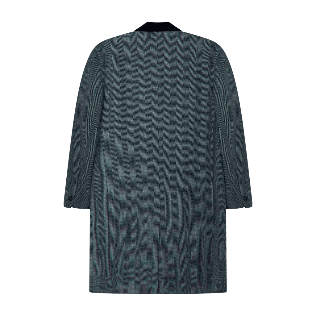 Dries Van Noten Wool Coat features front button closure, black cotton collar, buttoned cuffs, and three pockets.