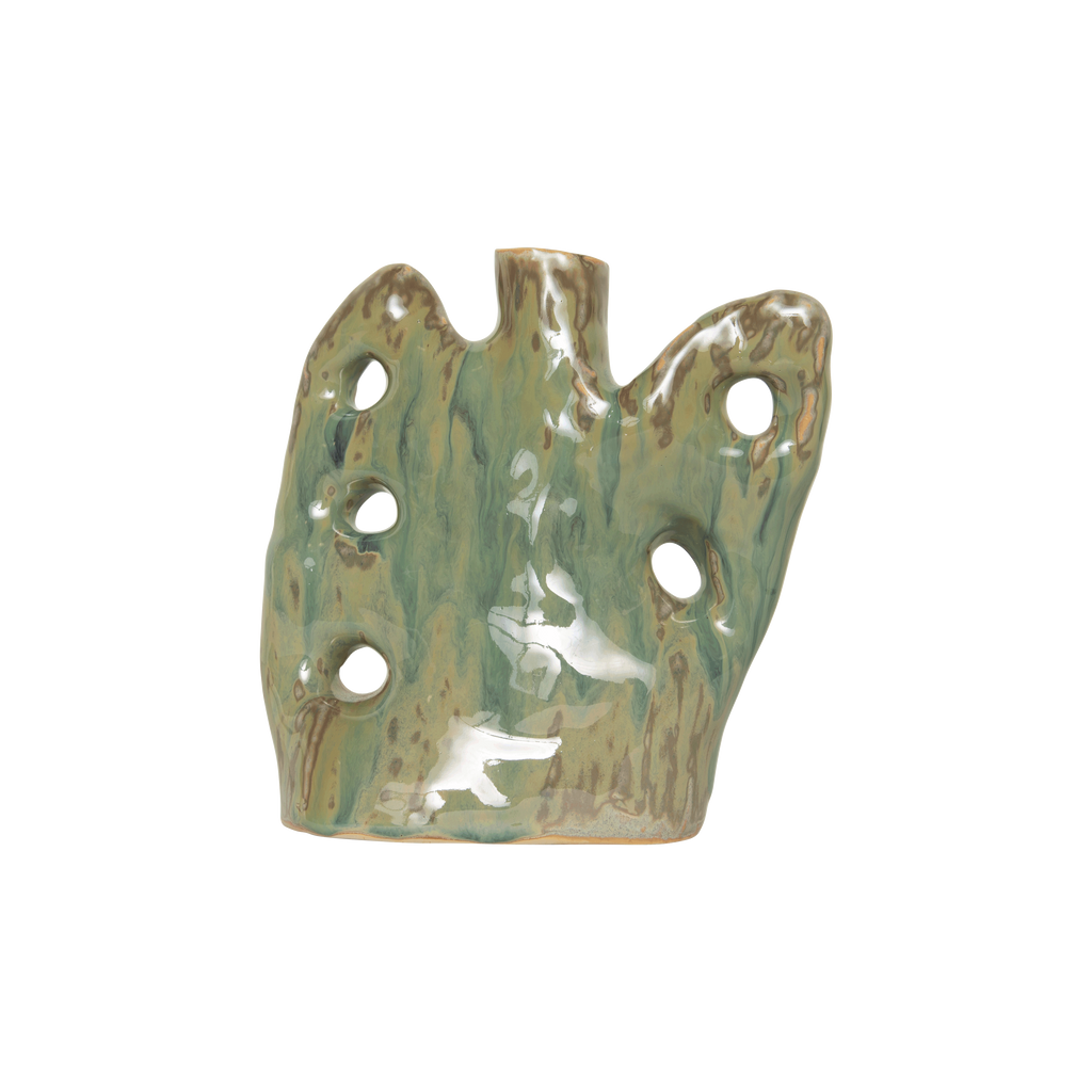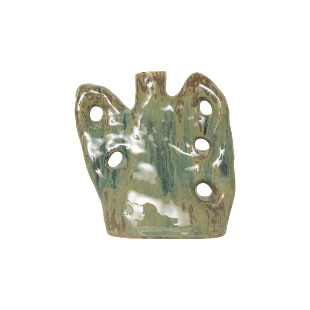 Drippy Teal Vase features 5 circle cut out designs and teal glaze.