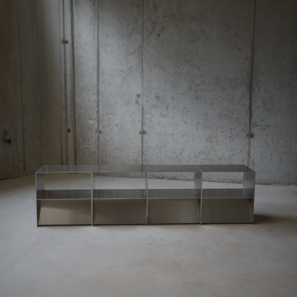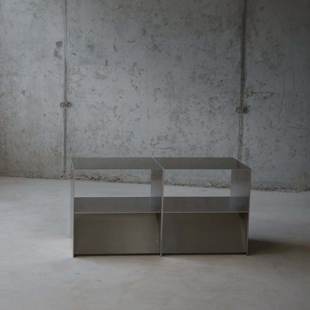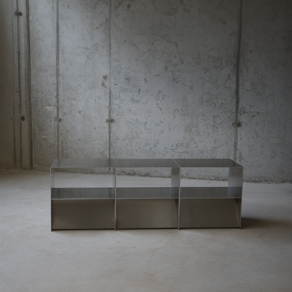 Handmade in our atelier near Berlin from durable aluminum. Designed as a modular system: use individually as a bedside table or combine multiple modules to create consoles, shelving walls, or room dividers