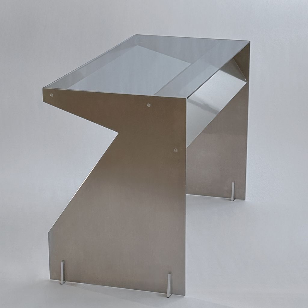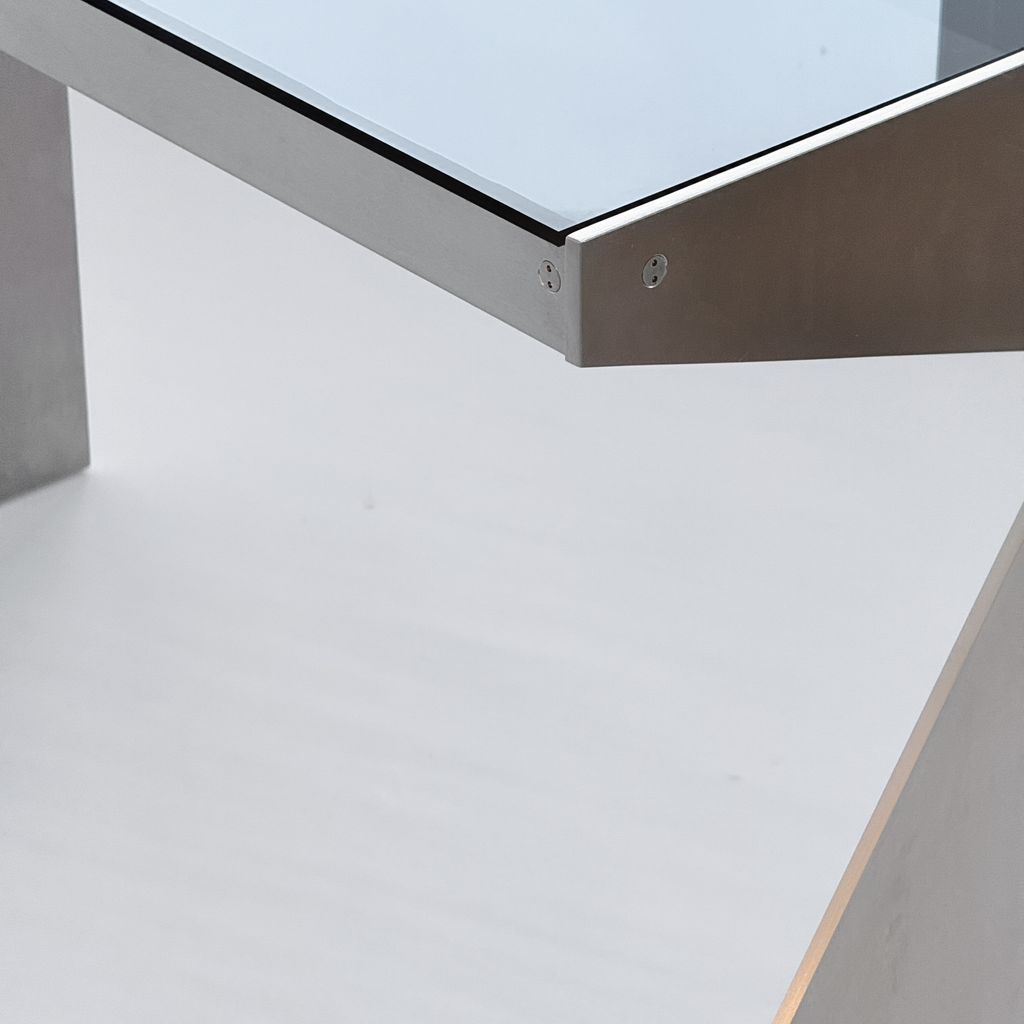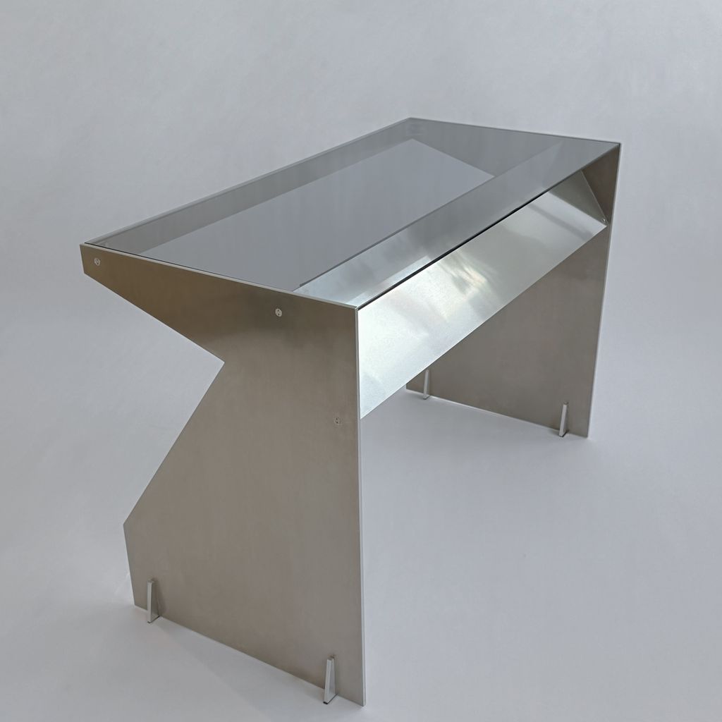 Handmade in our atelier near Berlin by artist Jakub Kubica. A fusion of industrial precision and organic materiality—hand-sanded aluminum, polished with natural beeswax, meets a dark-tinted glass top that dissolves visual weight while maintaining structural presence.