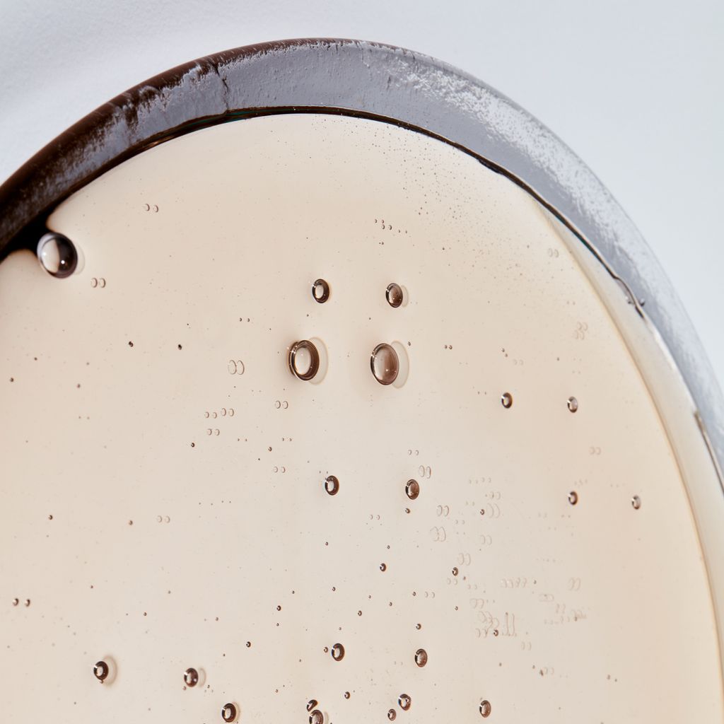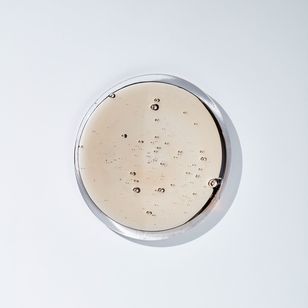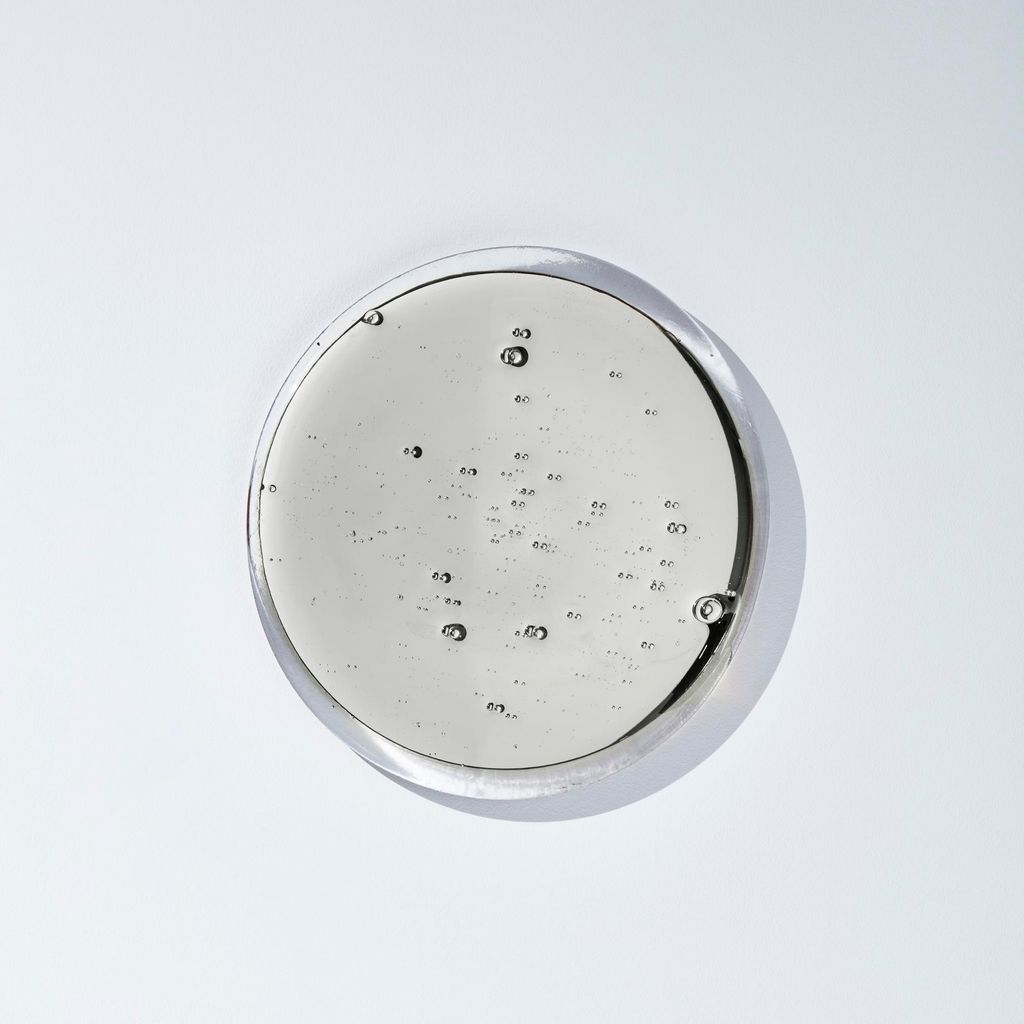 THE DROPLET MIRROR is a mirrorized glass rondel held off from the wall 1/2”. The form evokes a droplet of water caught on a window pane. Mirror is hung on a french cleat.
