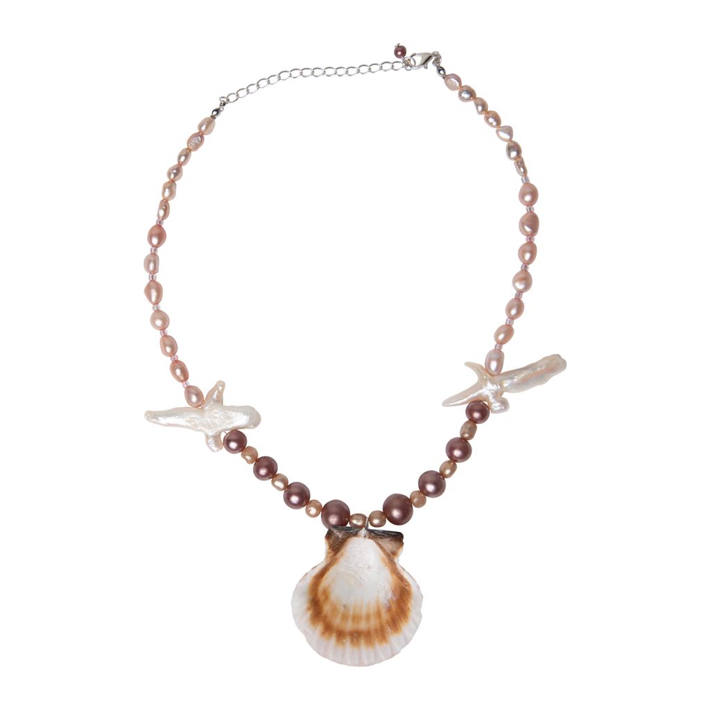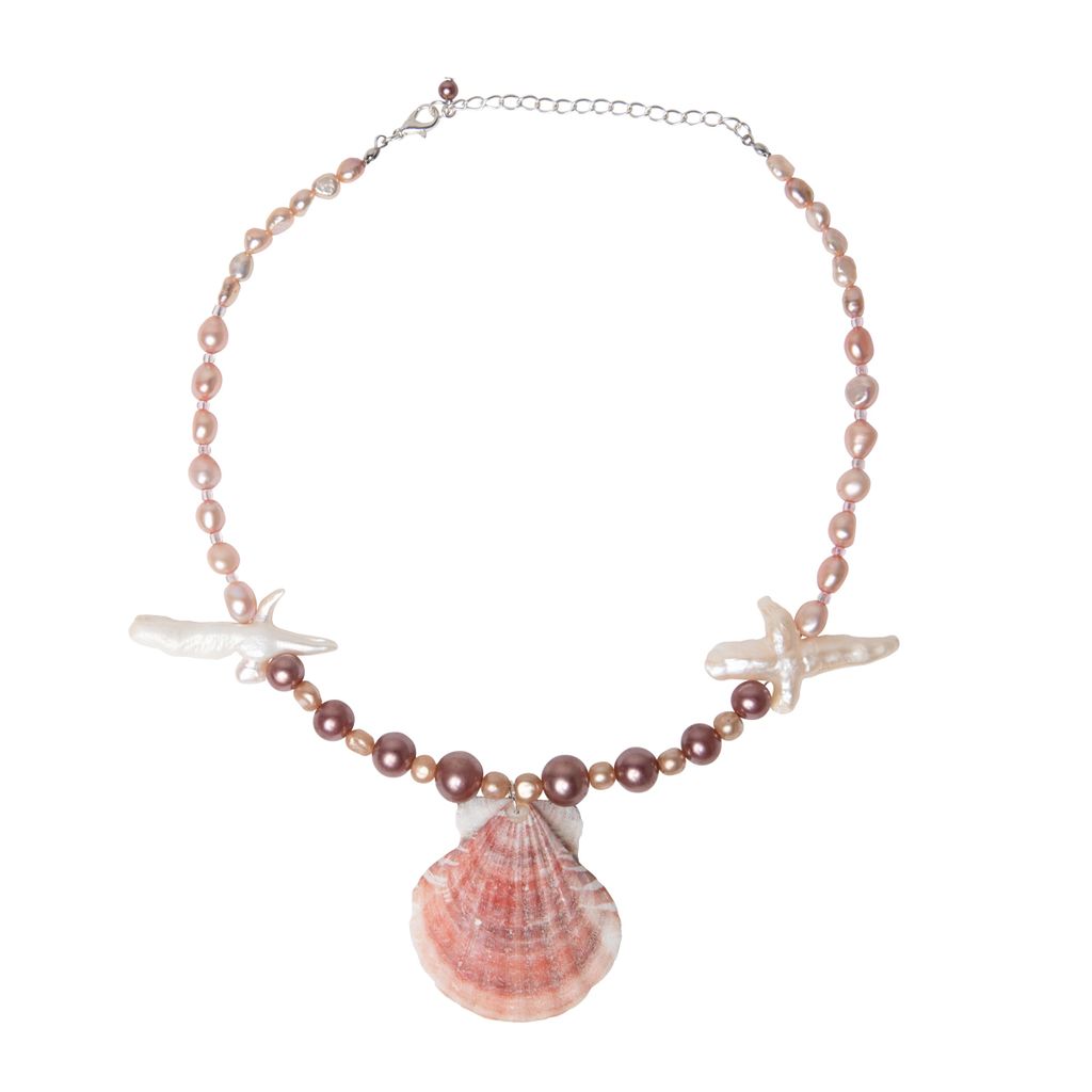 Dusk Symphony Necklace features a genuine pink scallop seashell, cross freshwater biwa pearls, repurposed purple beads, pink freshwater pearls, and a nickel free adjustable clasp. This necklace is inspired by sitting on the sand watching the sun set on the vibrant pink sea. Due to the nature of the seashells, please be gentle when handling and wearing!