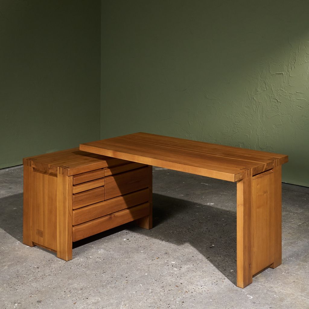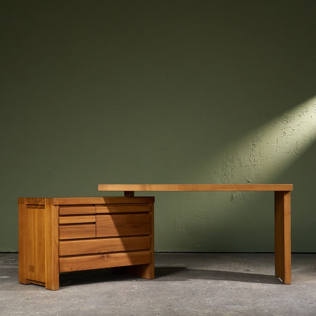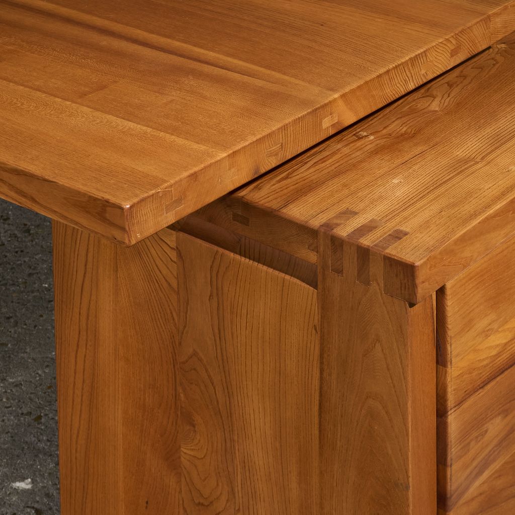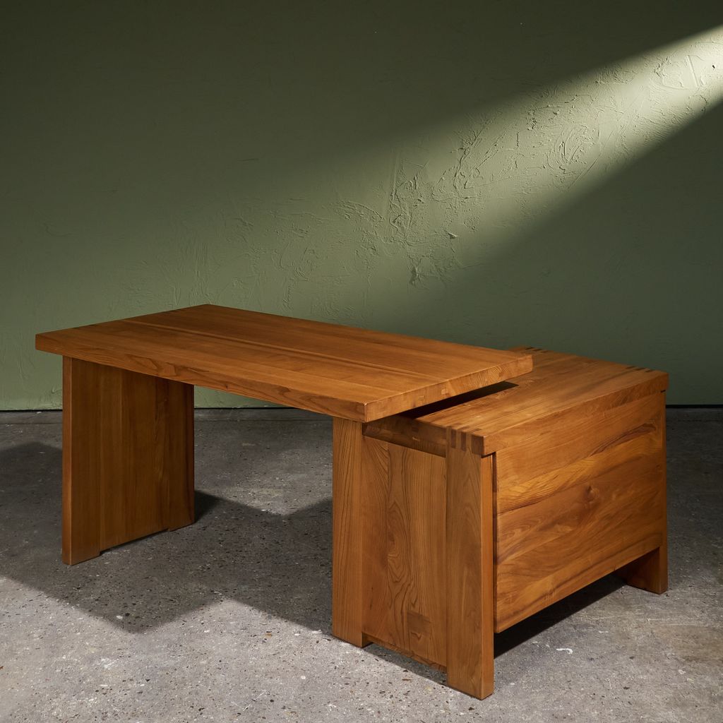 An early rare version of a B19 desk by Pierre Chapo in solid European elm, complete with its original return drawer block, with the rare feature of being completely finished with a solid elm back panel. Made in the late 1970s/early 1980s. The composition consists of two independent elements, the writing table and the drawer unit, which can be used in a variety of positions, as a basic L-shape, in a diagonal set-up or with the drawer block aligning straight with the table top. This flexibility allows the desk to adapt to different interiors while maintaining its architectural balance.