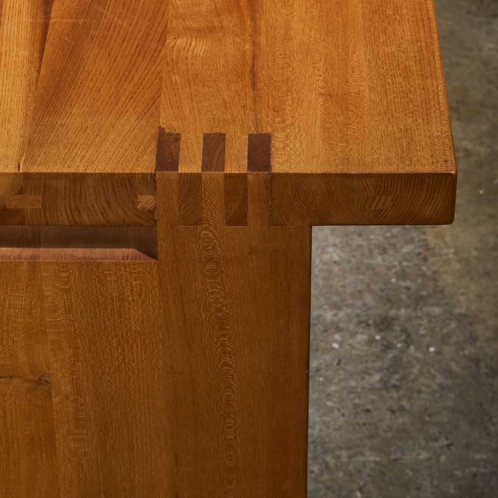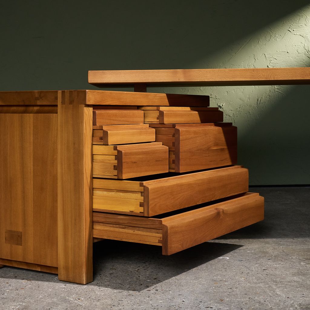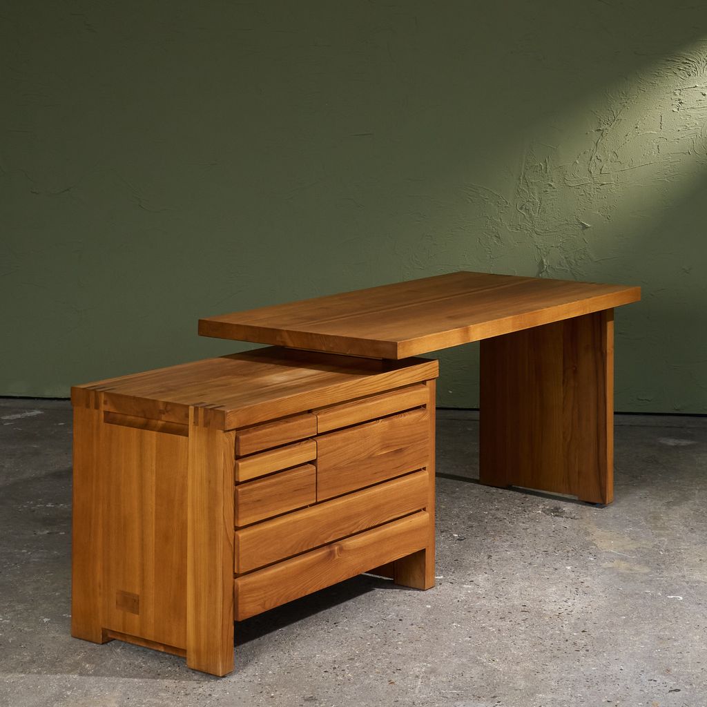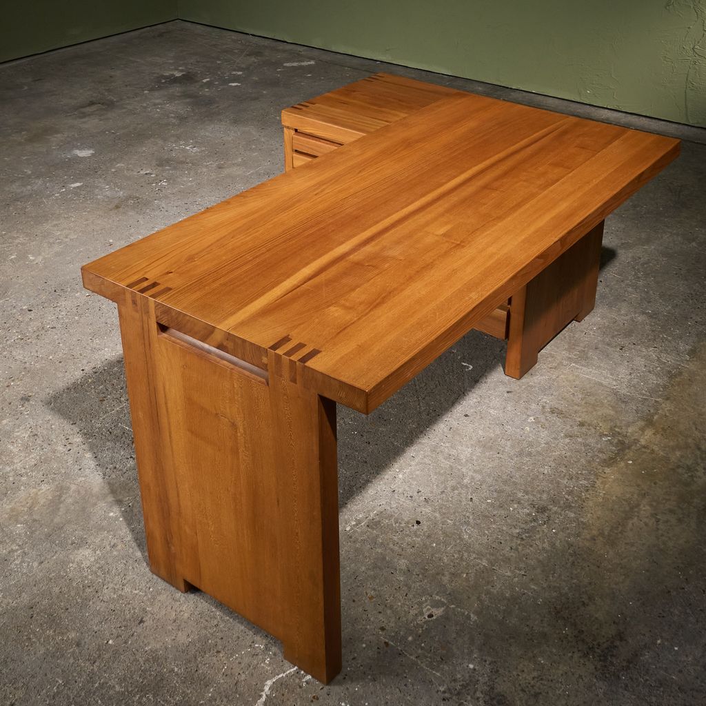 An early rare version of a B19 desk by Pierre Chapo in solid European elm, complete with its original return drawer block, with the rare feature of being completely finished with a solid elm back panel. Made in the late 1970s/early 1980s. The composition consists of two independent elements, the writing table and the drawer unit, which can be used in a variety of positions, as a basic L-shape, in a diagonal set-up or with the drawer block aligning straight with the table top. This flexibility allows the desk to adapt to different interiors while maintaining its architectural balance.