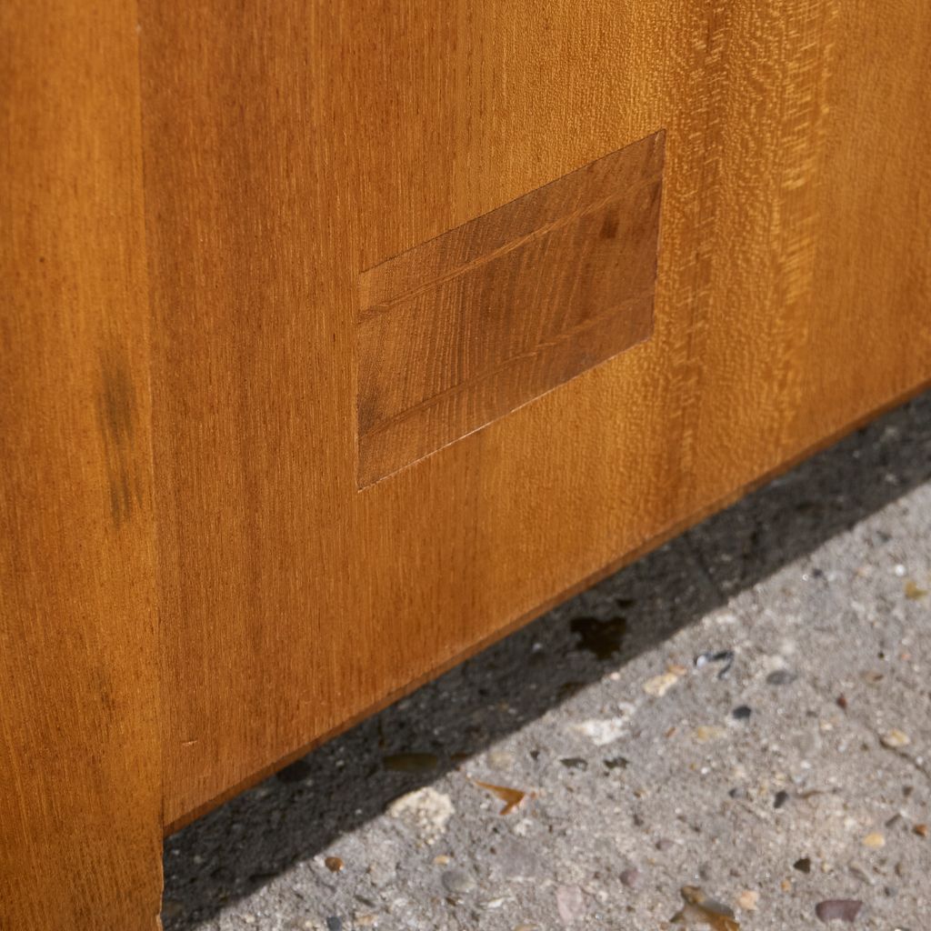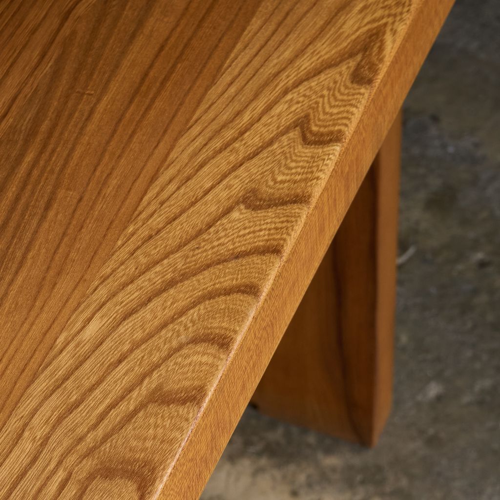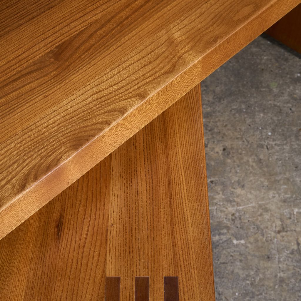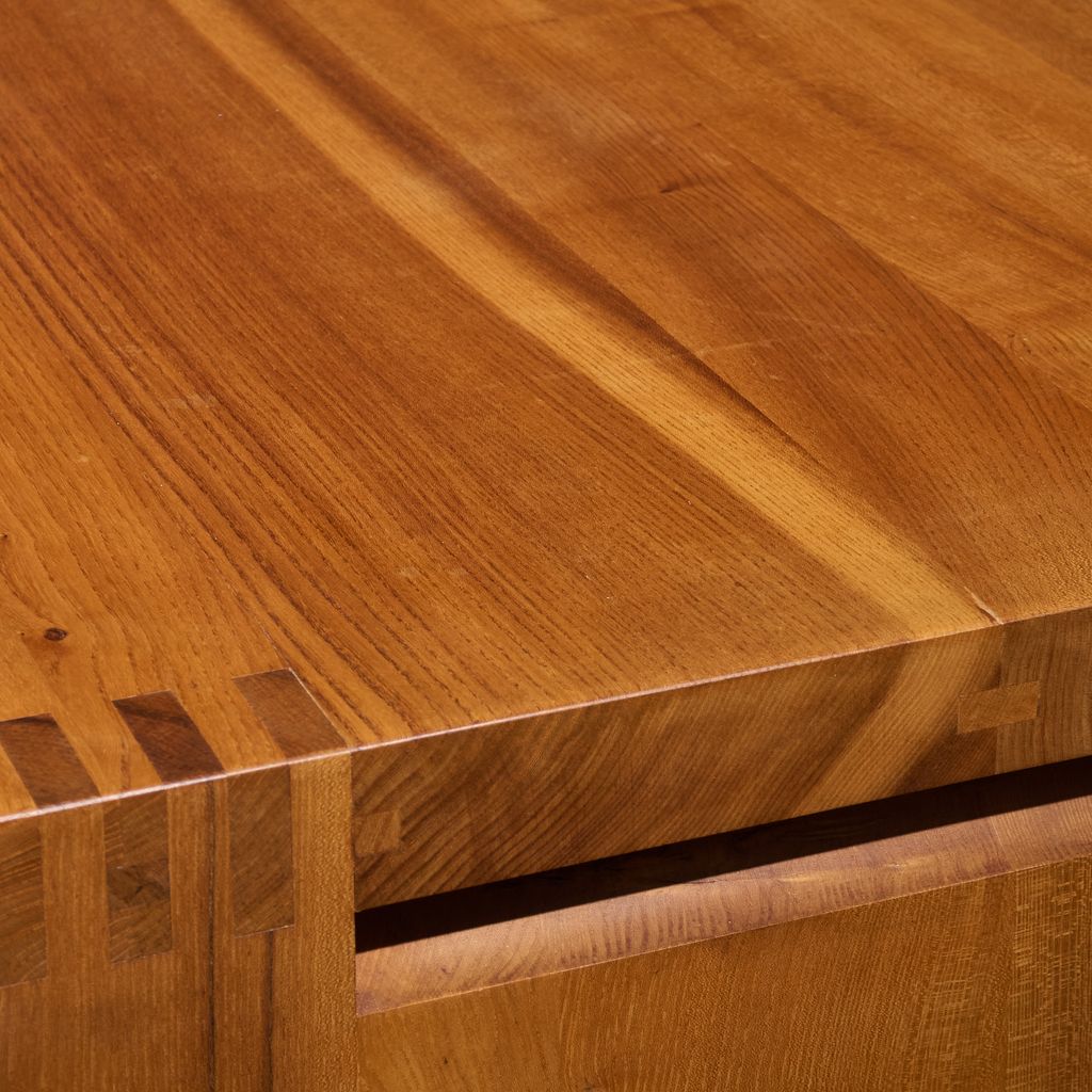 The solid European elm displays a strong, expressive grain across the top and drawer block. Over time the wood has developed a deep patina, characteristic of early productions. The entire piece is executed in solid timber. Exposed mortise-and-tenon joints and signature key joints define the construction. These connections are structural, direct and integral to the design. The rear of the drawer block is fully finished in solid wood, a rare feature that allows the desk to stand freely in a room.