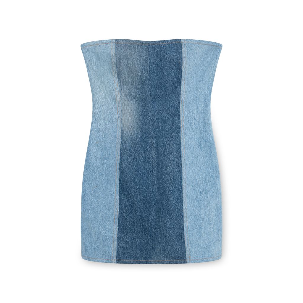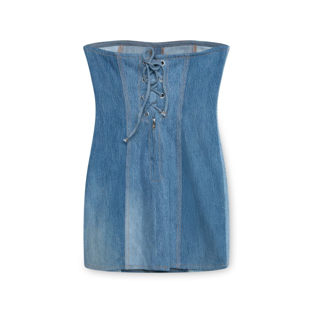 EB Denim Patchwork Denim Mini Dress features lace up back with zipper, silver hardware, sweetheart neckline, and body con fit.