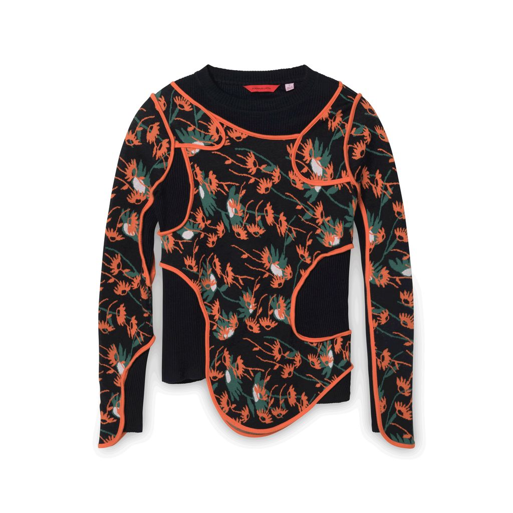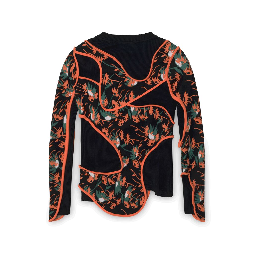 Eckhaus Latta Asymmetric Patchwork Floral Drip Top features orange detailing and knit floral pattern on black ribbed long sleeve.