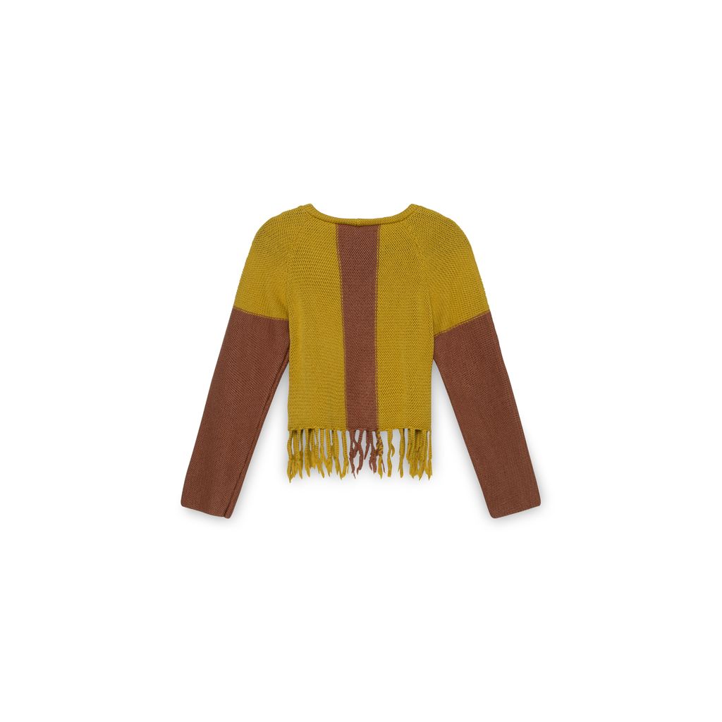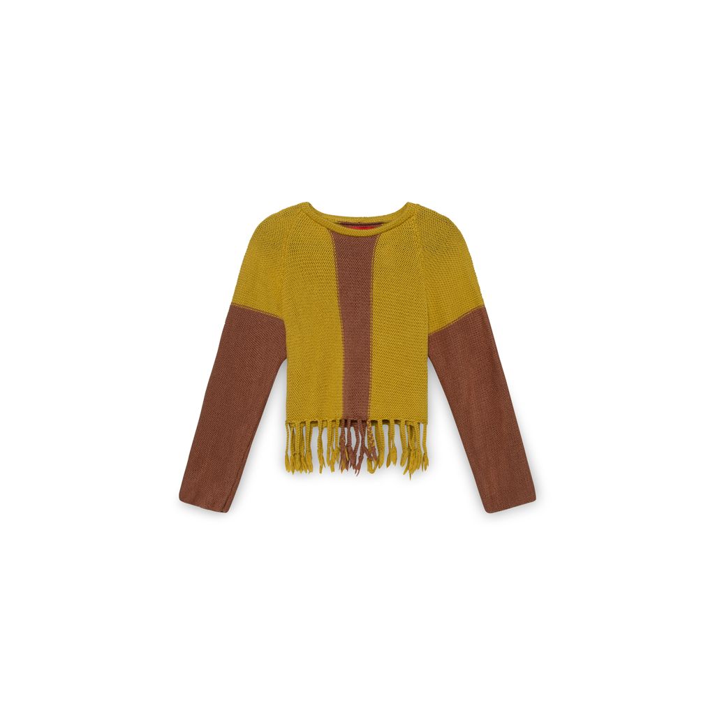 Eckhaus Latta sweater features vertical stripes in contrast colors and braided fringe hemline.