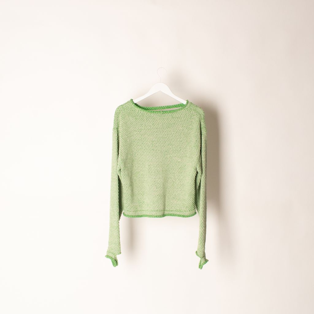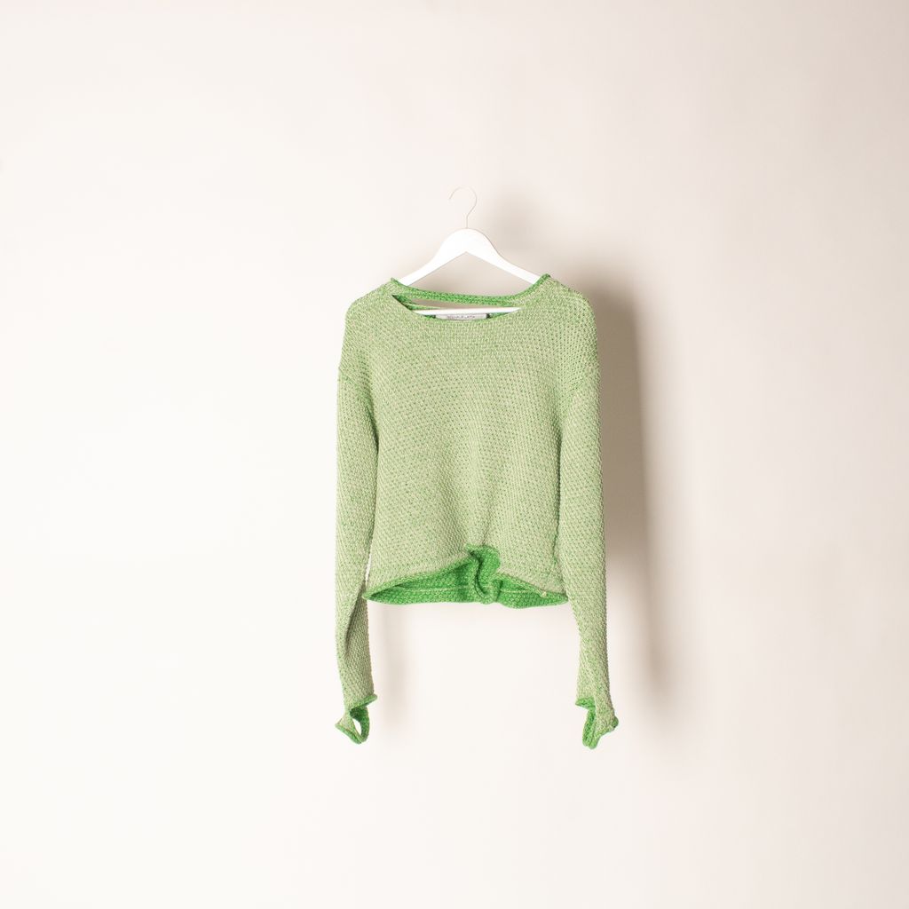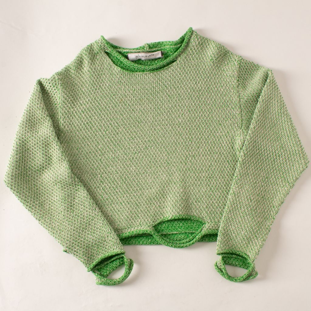 Slashed and tattered details at the neckline, elongated sleeves and hem bring grungy attitude to an essential sweater crafted from lightweight cotton.