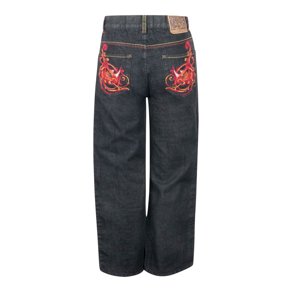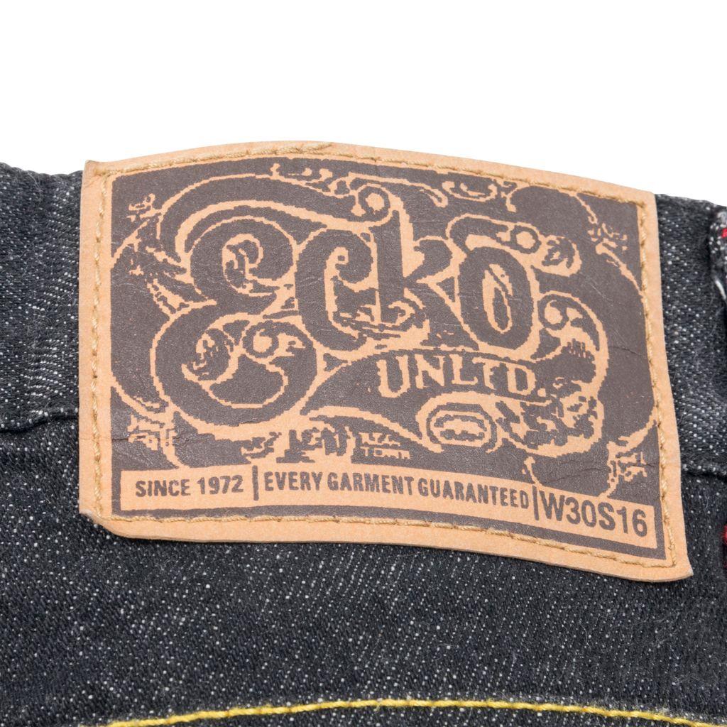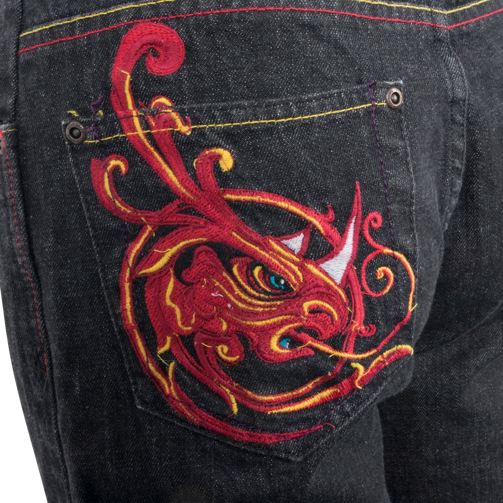 These black denim jeans from Ecko Unltd. are in perfect condition and feature contrast red and gold stitching along the seams. These jeans have a button-fly closure and functional front/back pockets. Dragon patch detail on back pockets. Gently worn.
