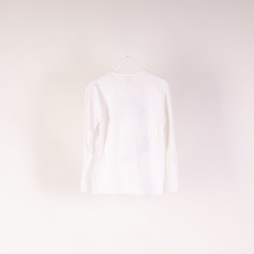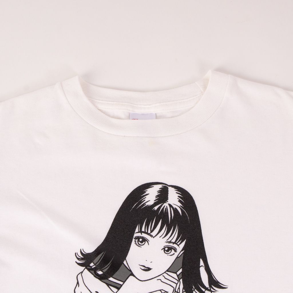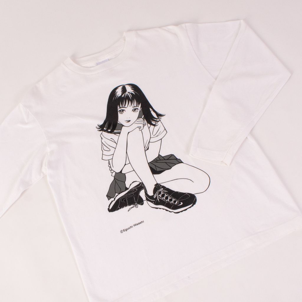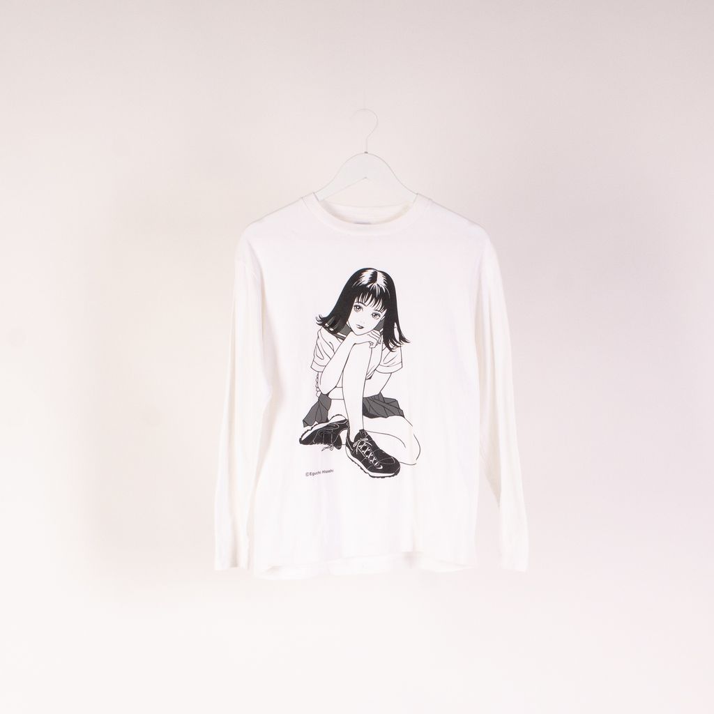 This long sleeve is a graphic gem with its design from Eguchi Hisashi, one of Japan's most prominent illustrators of female characters in manga. Features long sleeve design, front screen printed drawing, and minor signs of wear. Signs of wear include stain at neck.