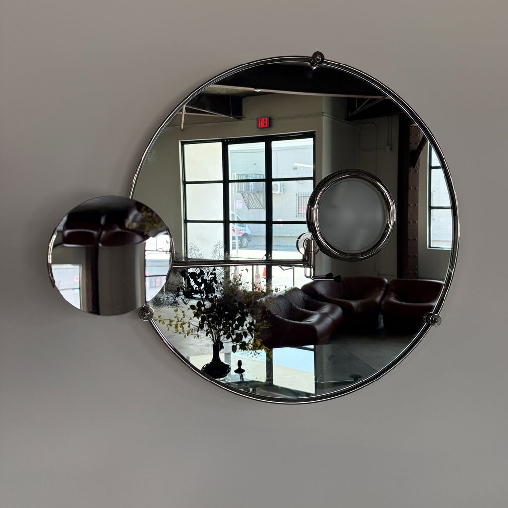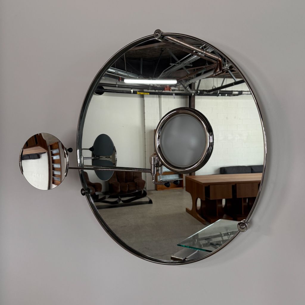 Large circular frame with two swing arm attachments. One arm with a magnifying mirror and the other with a sanded convex glass lamp. The mirror was designed by Eileen Gray as part of the furnishings for Villa E-1027 —her first architectural project and her holiday home with architect Jean Badovici in the south of France.