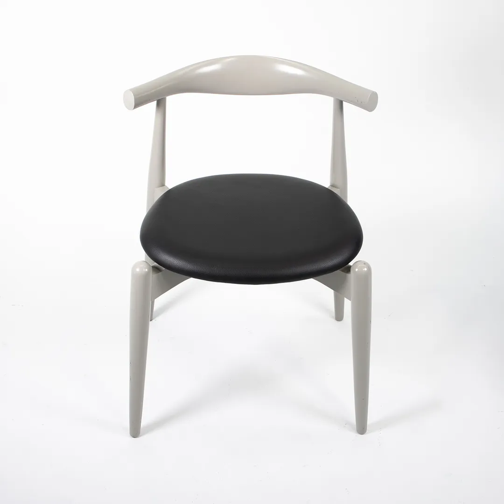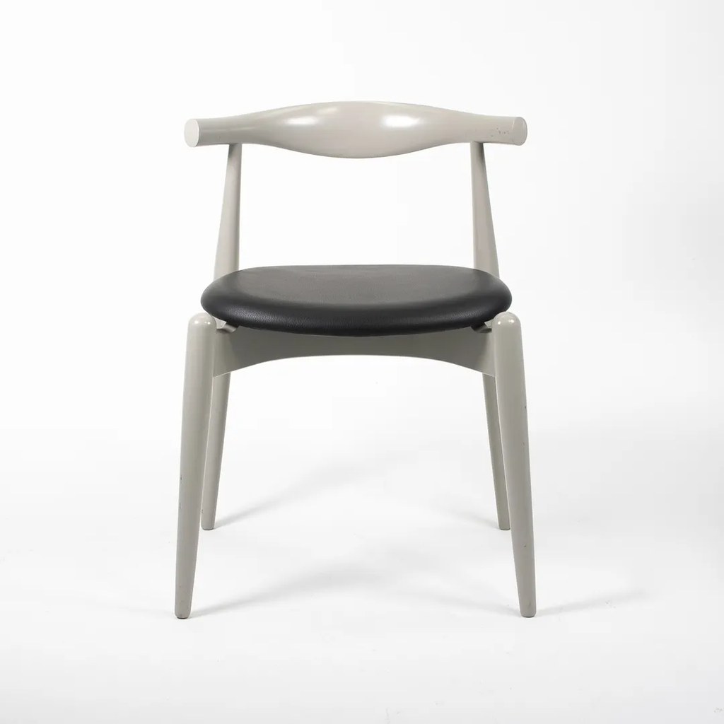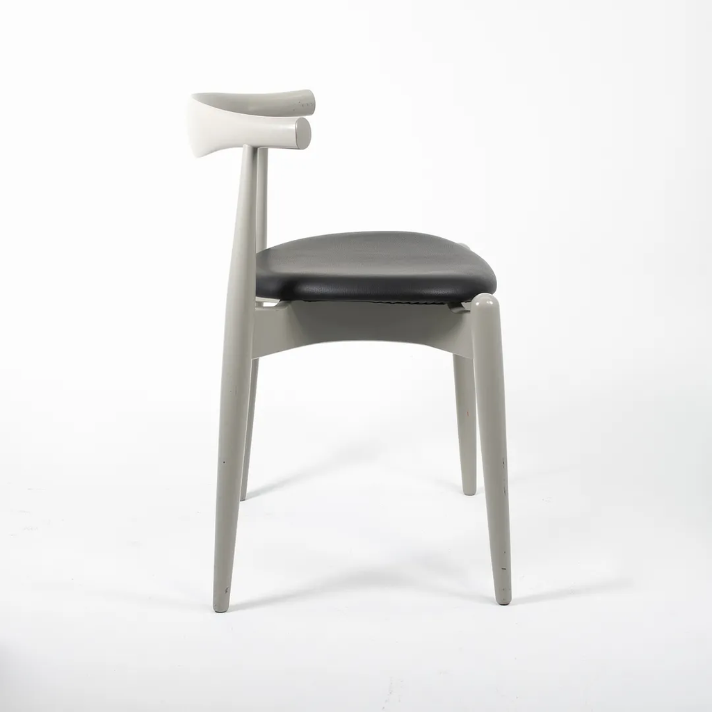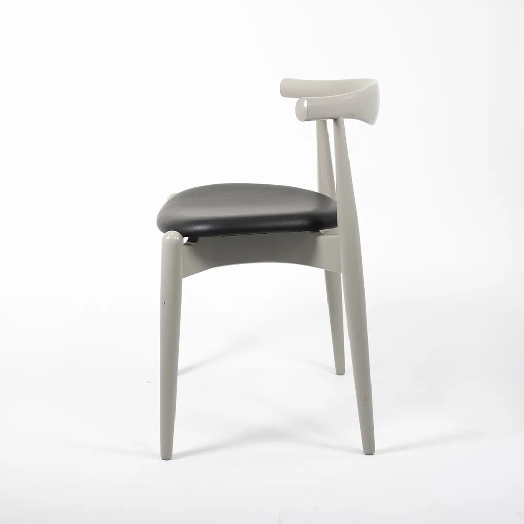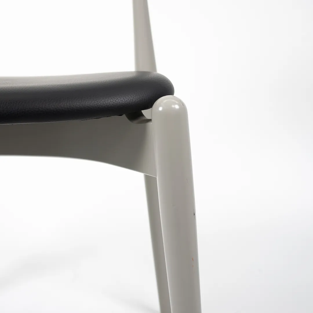 This is a CH20 Elbow Dining Chair designed by Hans Wegner and produced by Carl Hansen & Son in Denmark. The chair is made with a solid beech frame painted grey, and a black Thor 301 leather seat. The chair dates to circa 2020 and is guaranteed as authentic. Condition is very good with some scuffs on the paint. We can touch-up and further clean it up if the customer desires. See photos. This chair came directly from Carl Hansen. This was used as a floor model in one of their showrooms.