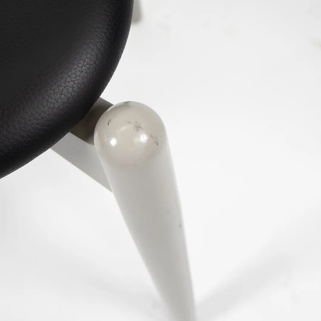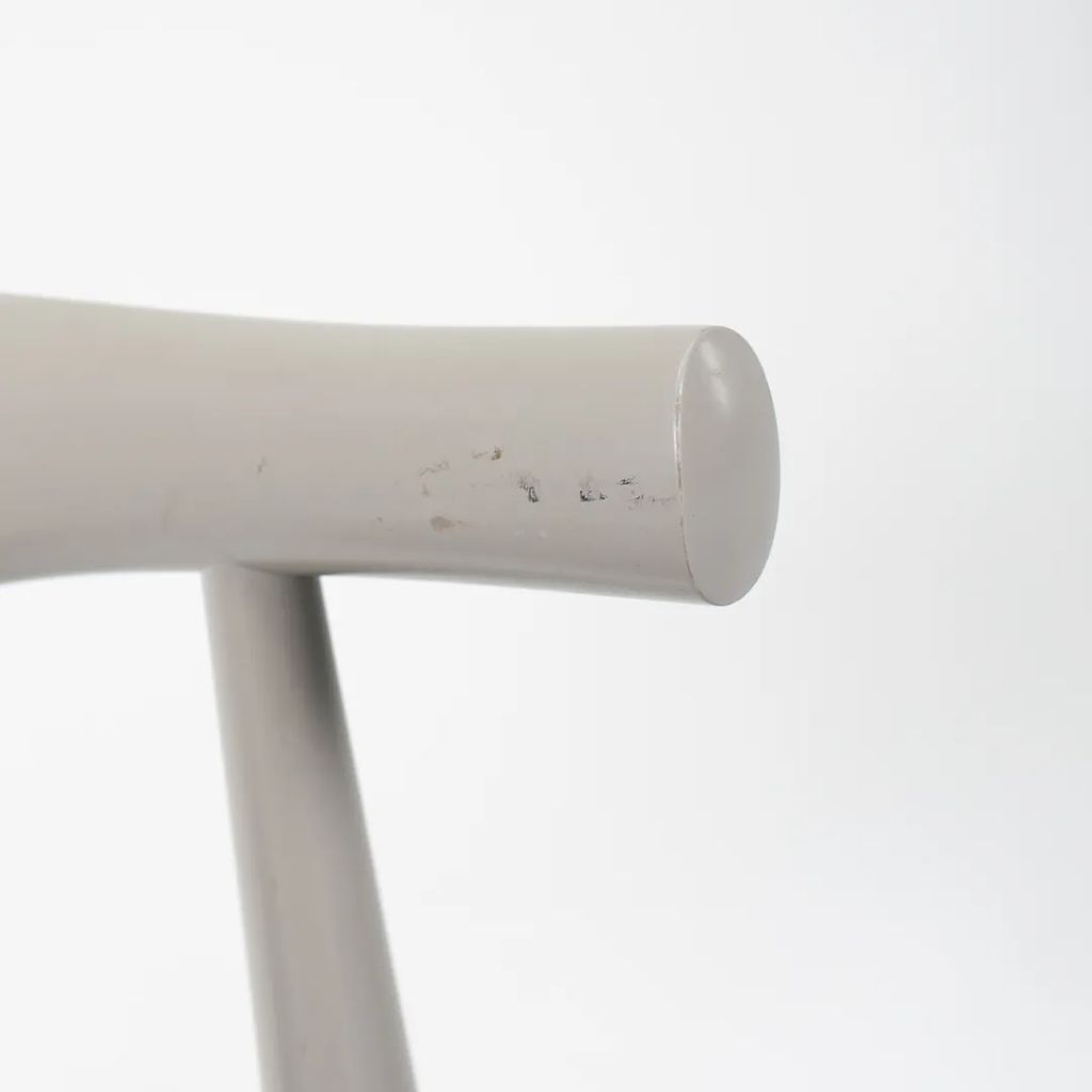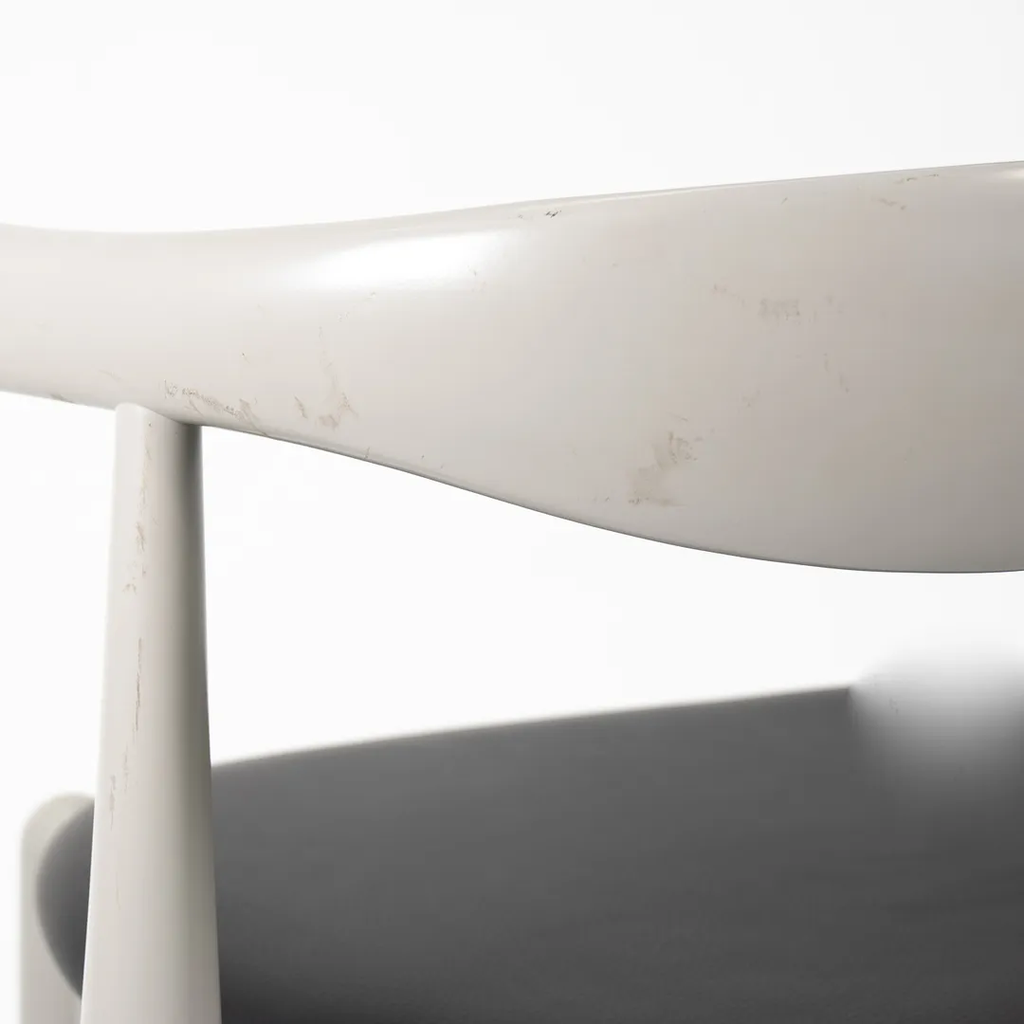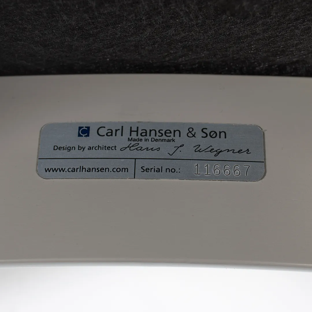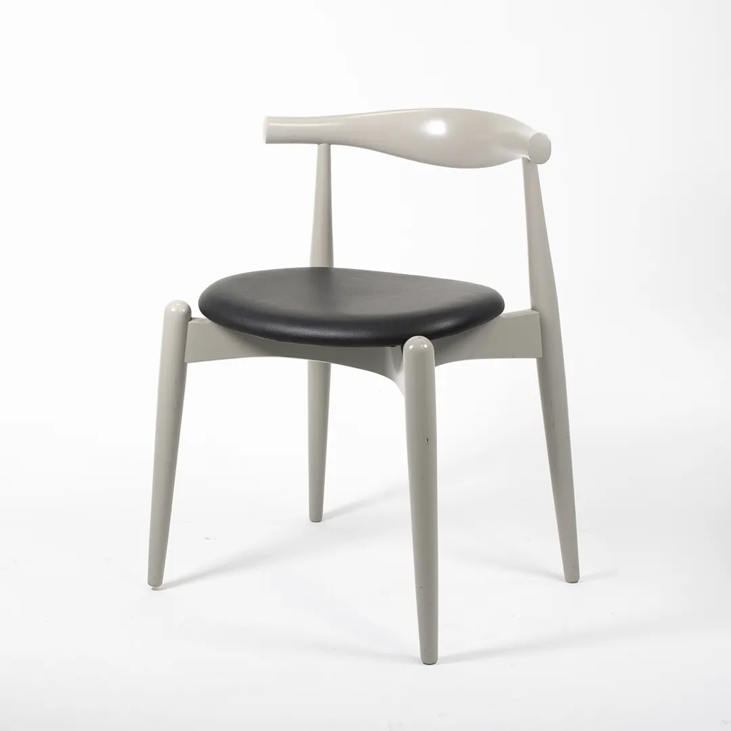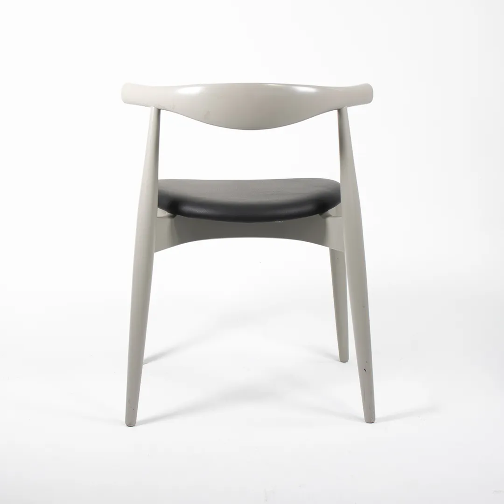 This is a CH20 Elbow Dining Chair designed by Hans Wegner and produced by Carl Hansen & Son in Denmark. The chair is made with a solid beech frame painted grey, and a black Thor 301 leather seat. The chair dates to circa 2020 and is guaranteed as authentic. Condition is very good with some scuffs on the paint. We can touch-up and further clean it up if the customer desires. See photos. This chair came directly from Carl Hansen. This was used as a floor model in one of their showrooms.