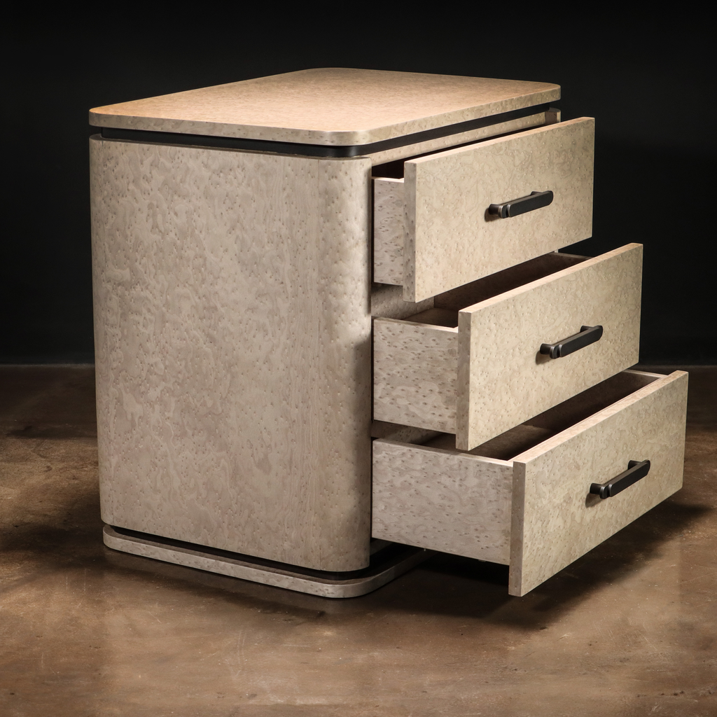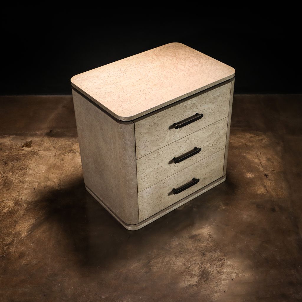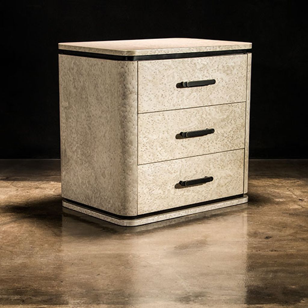 Elena modern bedside table, shown in gray birdseye maple & bronze. Available as shown or customizable to your desired size, shape, and finish.