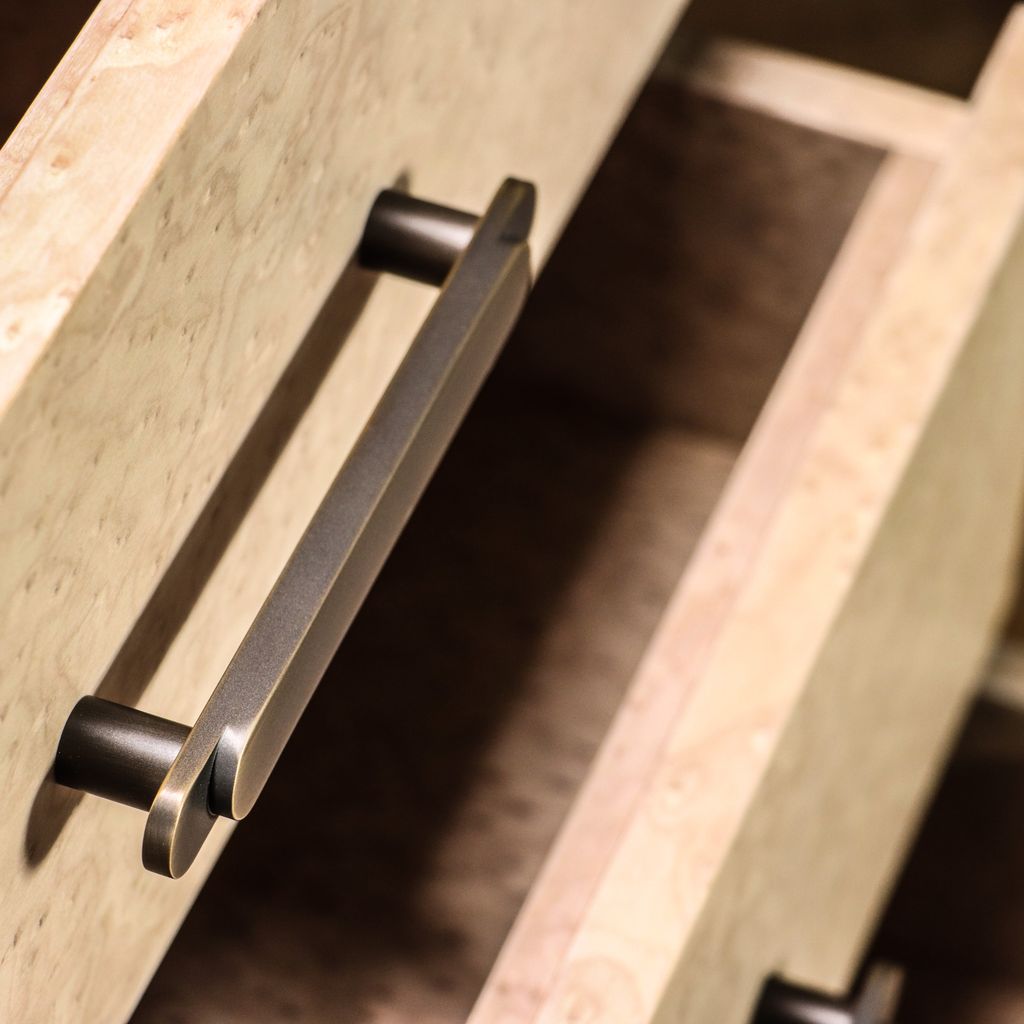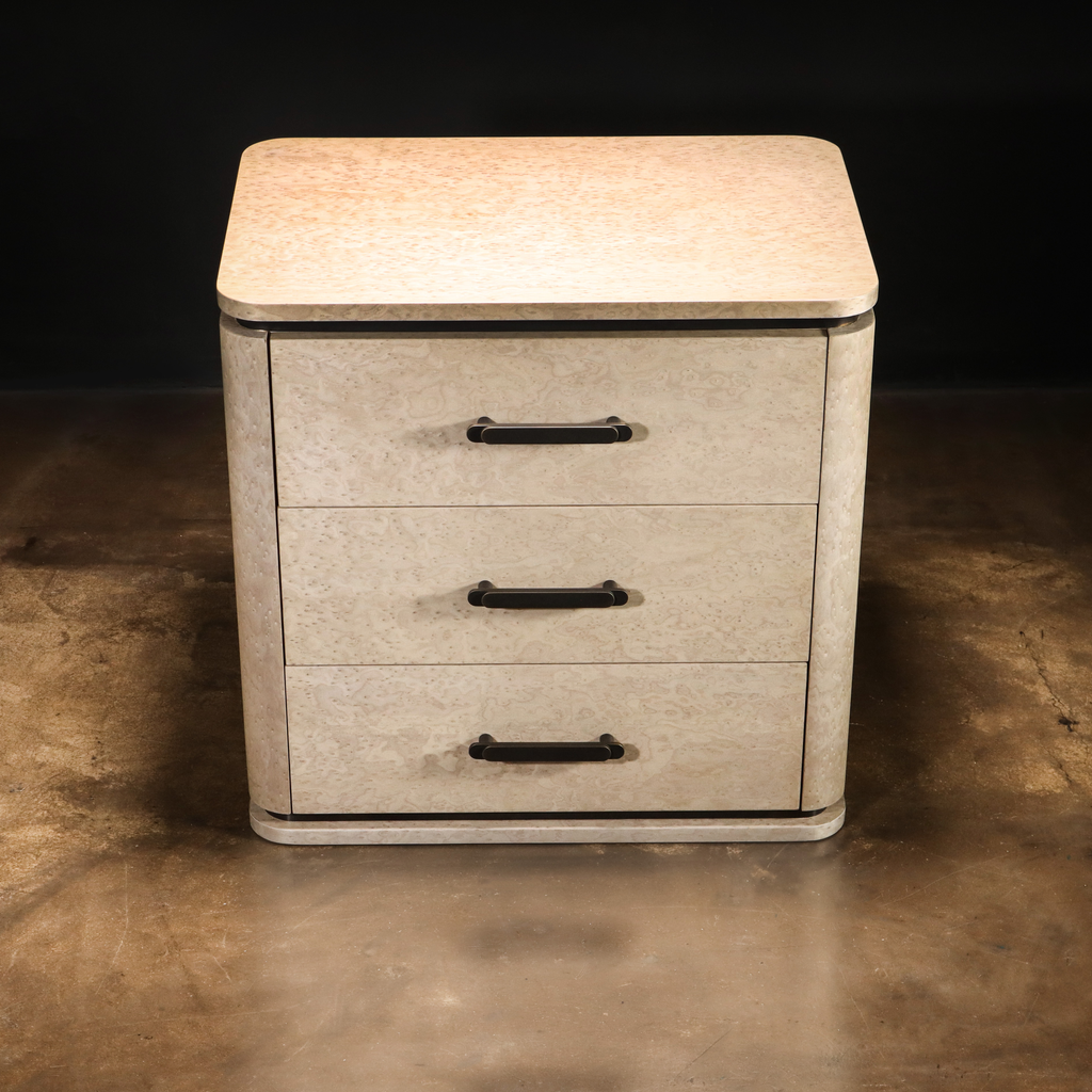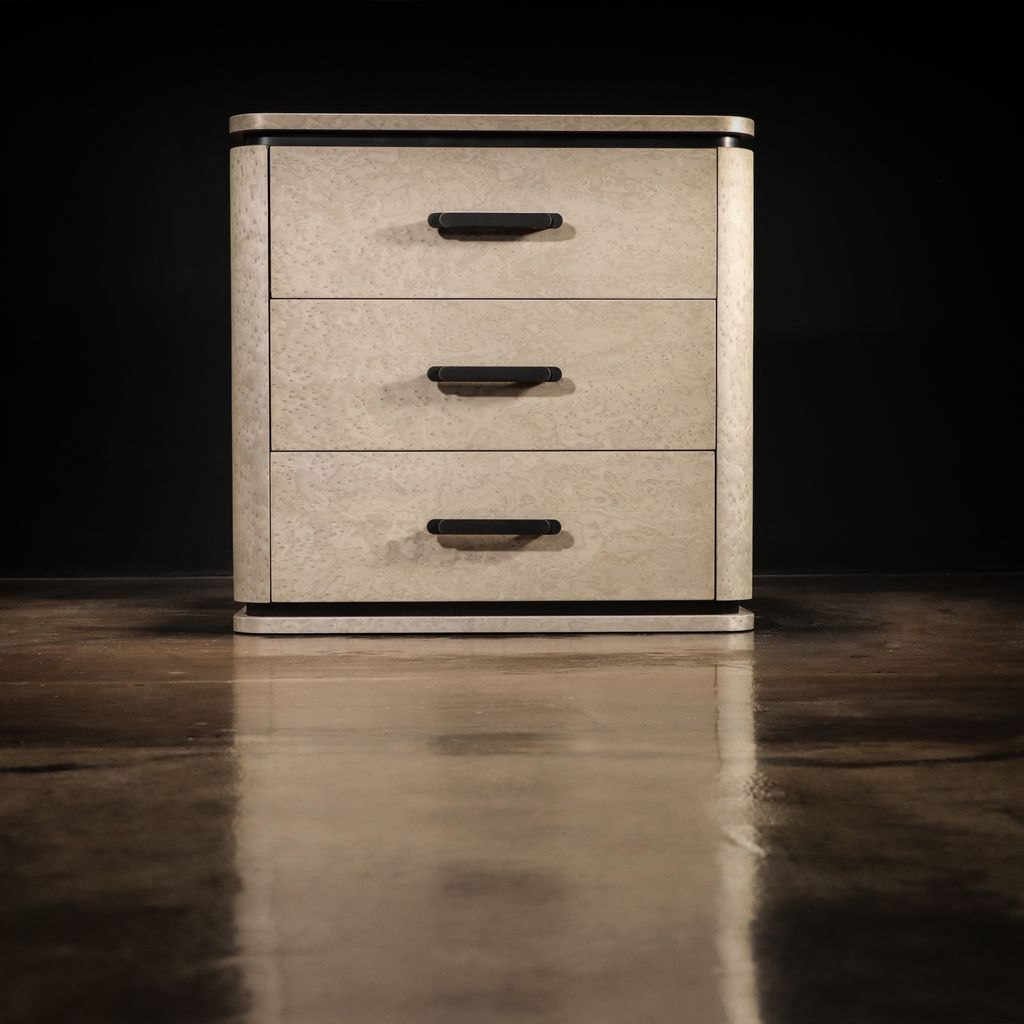 Elena modern bedside table, shown in gray birdseye maple & bronze. Available as shown or customizable to your desired size, shape, and finish.