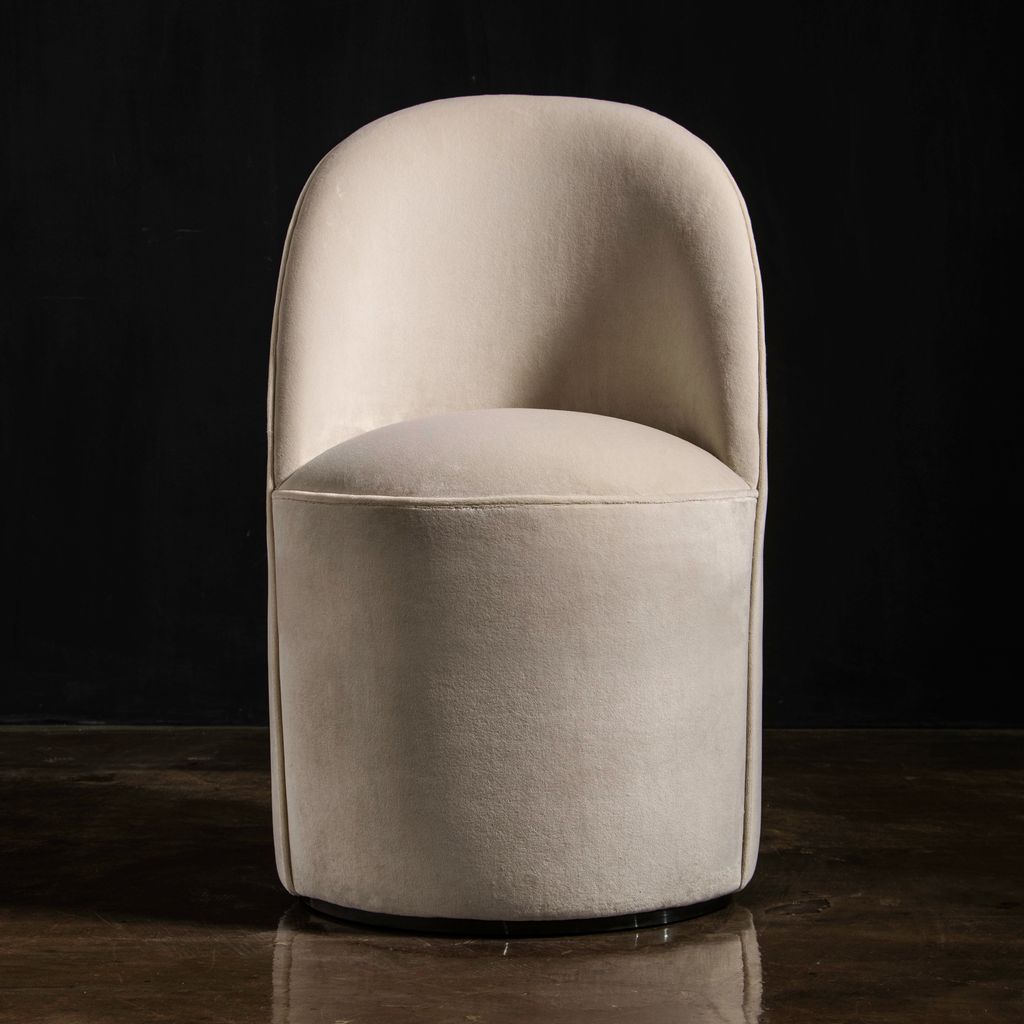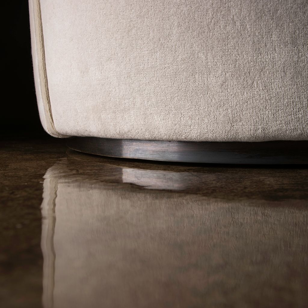 This elegant, modern yet timeless dressing chair features a swivel and can be upholstered in the material of your choice. Choose from standard fabric, leather or sheepskin options, or your own material. Features an oil rubbed bronze base as shown. Also available in blackened metal, natural bronze or brass, and any finish wood.