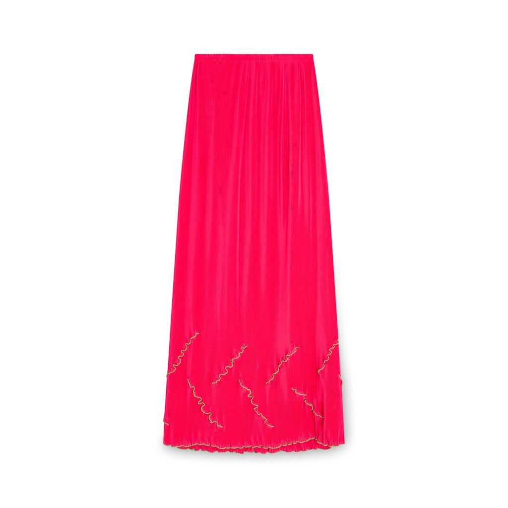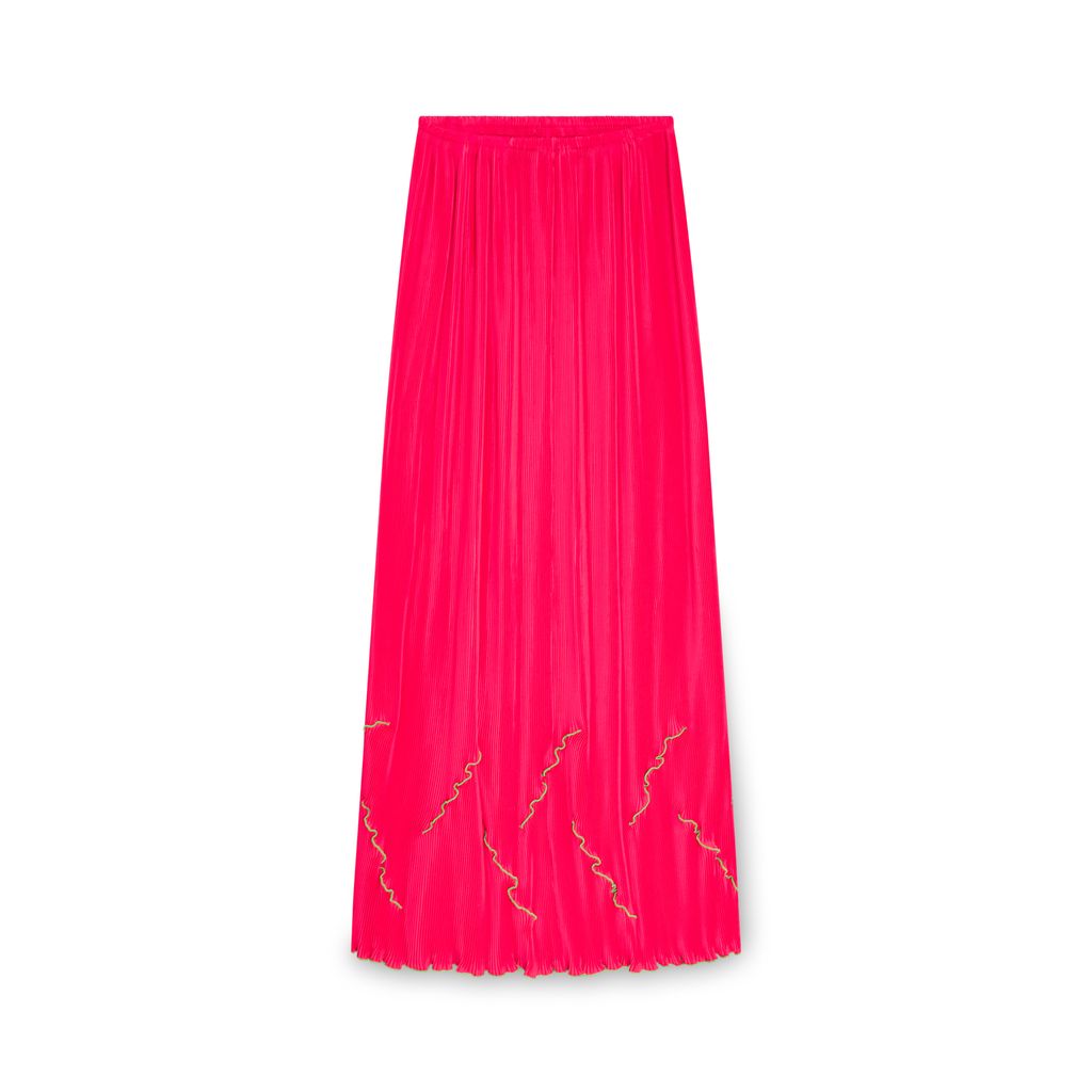Ellen Hauptli Pleated skirt features an elastic waistband, intricate pleated details, green embroidery details near the bottom, and a straight fit