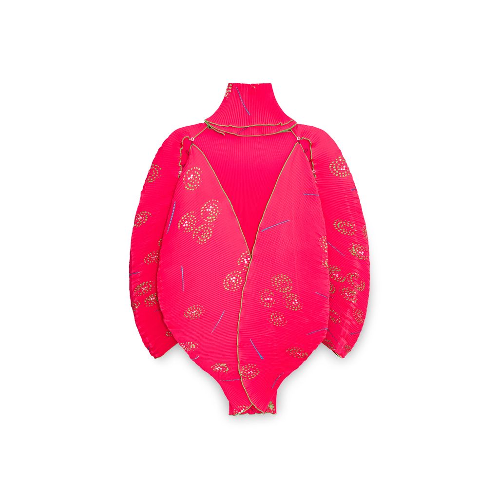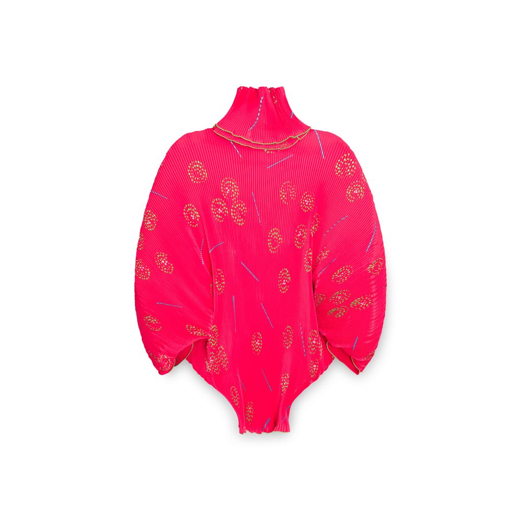 Ellen Hauptli Pleated Coccoon Shawl features a unique rounded shape, intricate pleated detail, blue and green watercolor prints, adjustable sleeves, and small button closure details