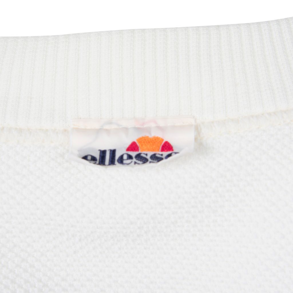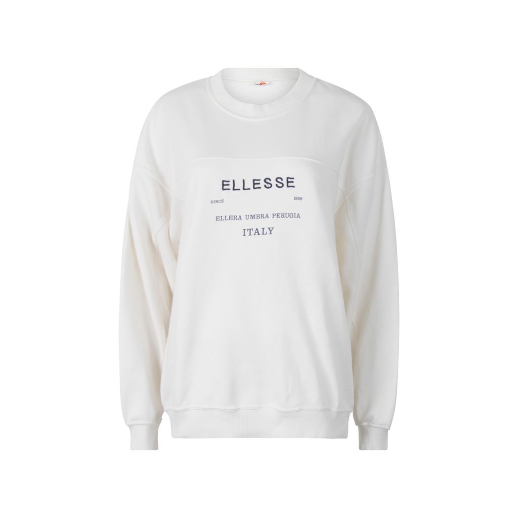 This vintage Ellesse sweatshirt features a ribbed round neck collar, embroidered "ELLESSE" front text, printed text "ELLERA UMBRA PERUGIA ITALY" and long sleeves. It has a centered panel construction. In excellent condition, no signs of wear, oversized fit.