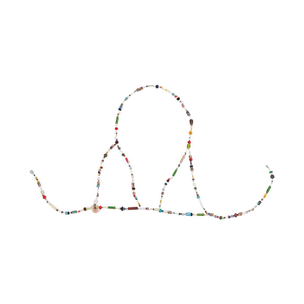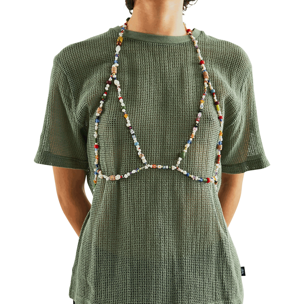 HANDMADE, ADJUSTABLE, BEADED BATHING SUIT CRAFTED WITH UNIQUE CHARMS AND FRESH WATER PEARLS :) FEATURING ALL CAPS STUDIO LOGO