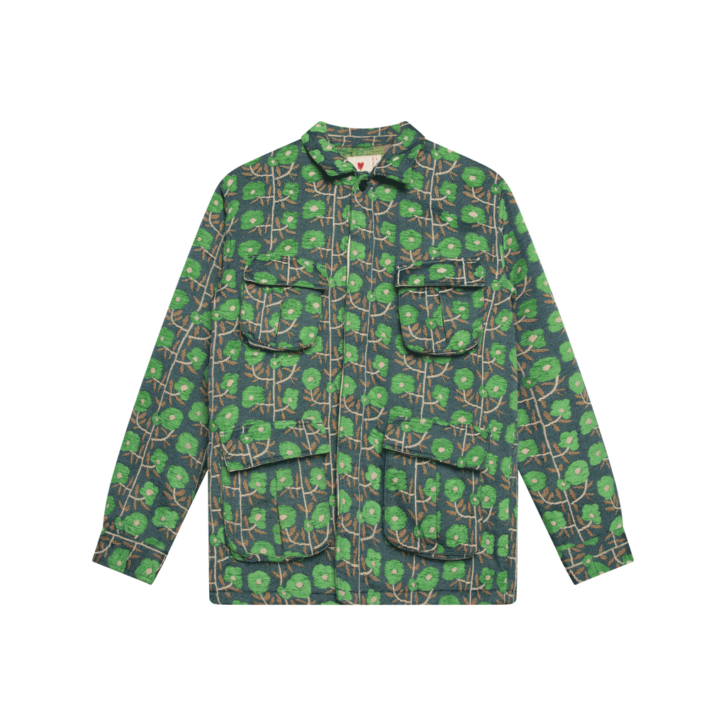 Emotionally Unavailable Field Jacket features classic collar, hidden front button closure, four utilitarian pockets, and gobelin green floral print design.