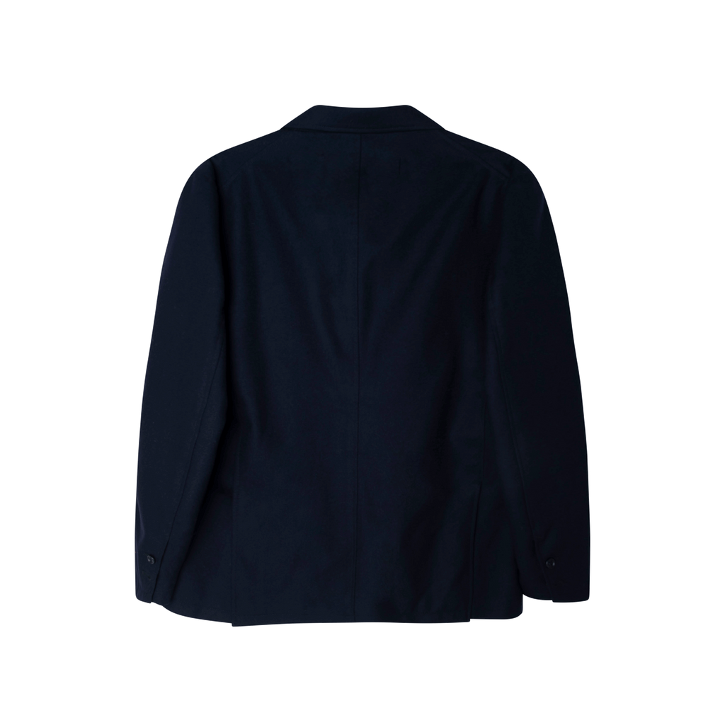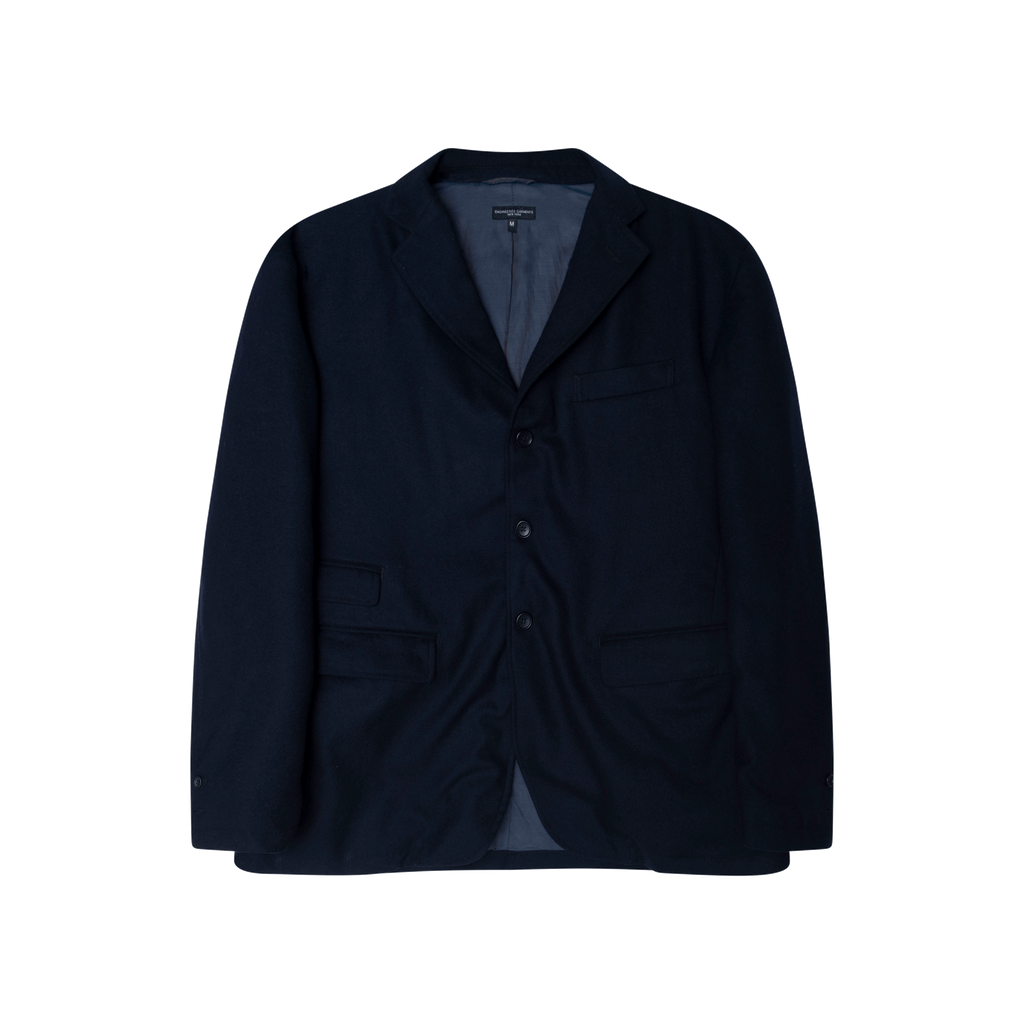 Engineered Garments Navy Notched Lapels Single Breast Blazer features notched lapels, front button fastening, 2 front flap pockets, chest flap pocket, long sleeves, buttoned cuff sleeves, straight hem, and English rear vents.