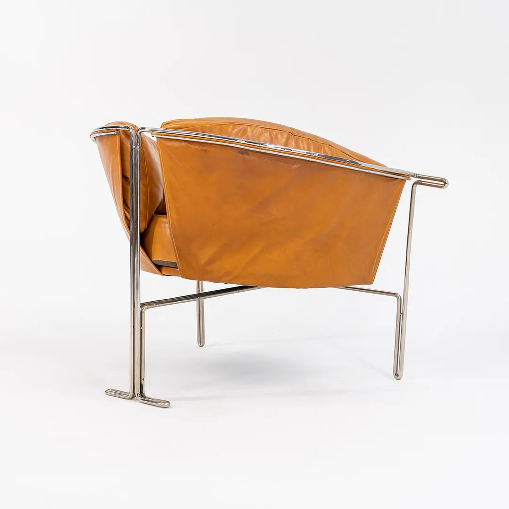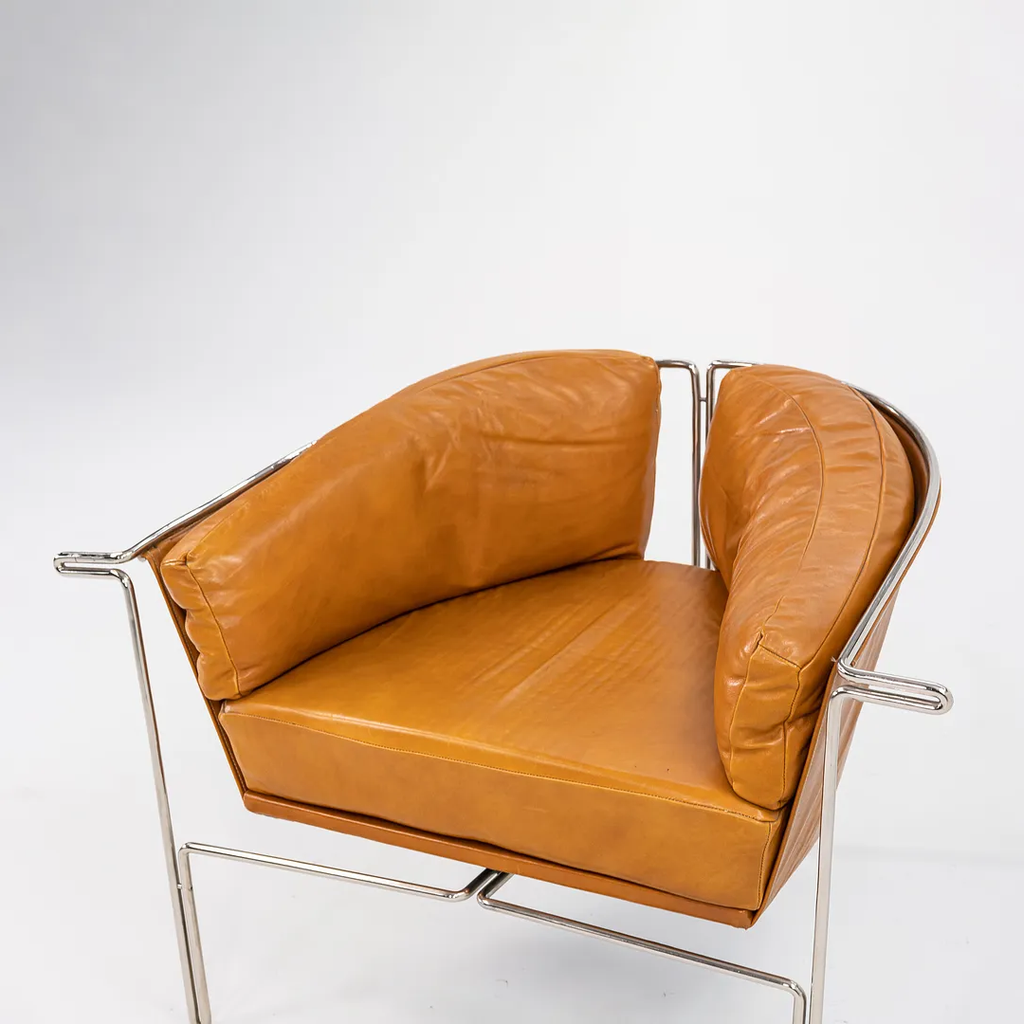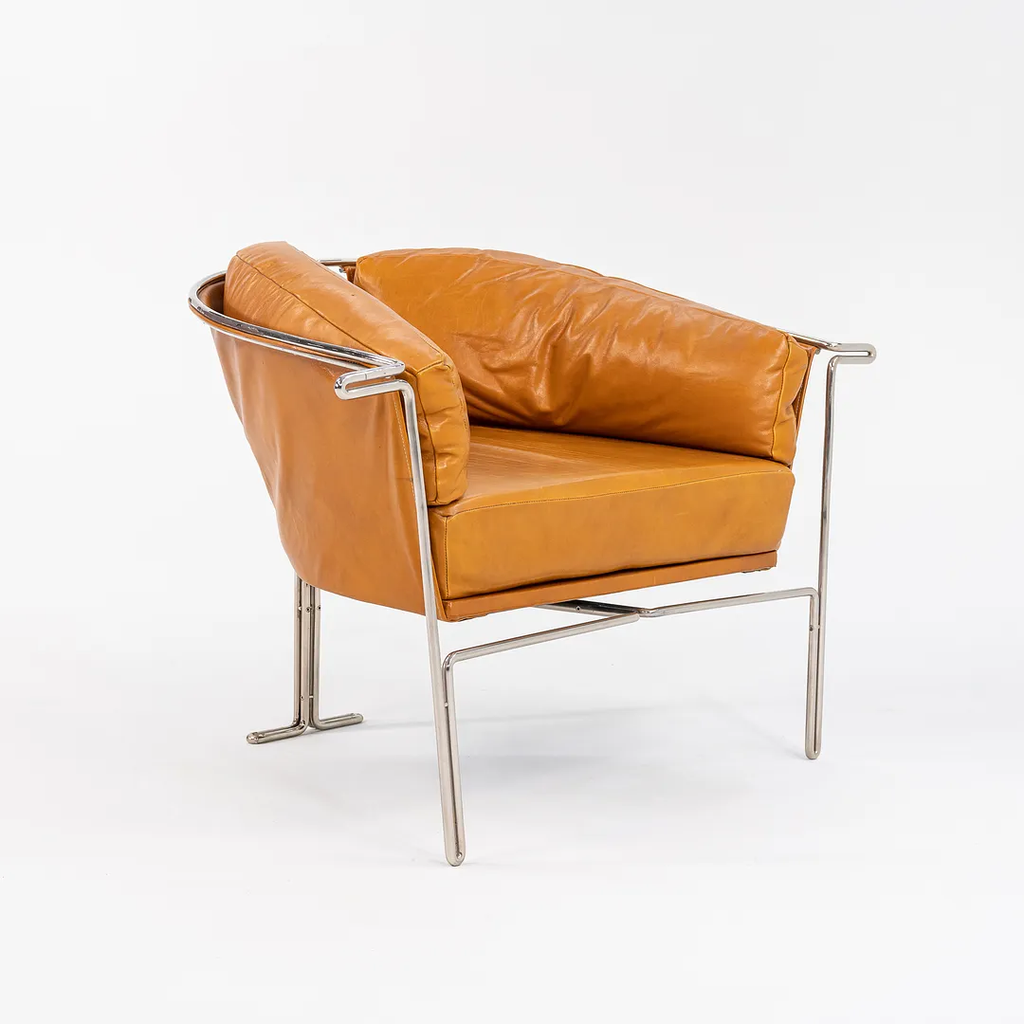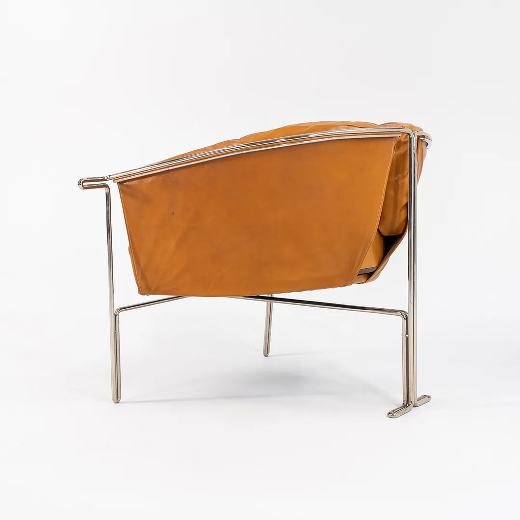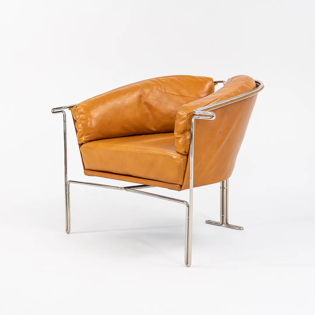 This is a rare prototype lounge chair from the Entelechy series, designed by architect John Portman and produced by Saporiti-Italia. This was part of the Gratz Industries private collection and came directly from Gratz's facilities. It is upholstered in a light cognac leather with chromed steel frame.